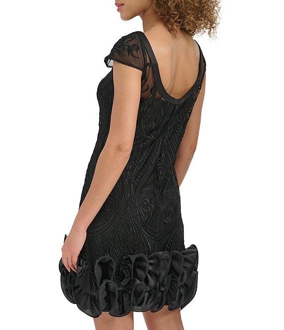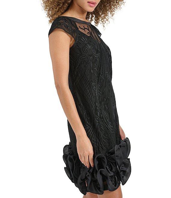 Kensie Embroidered Mesh Boat Neck Cap Sleeve Scoop Back Ruffle Hem Mini Dress