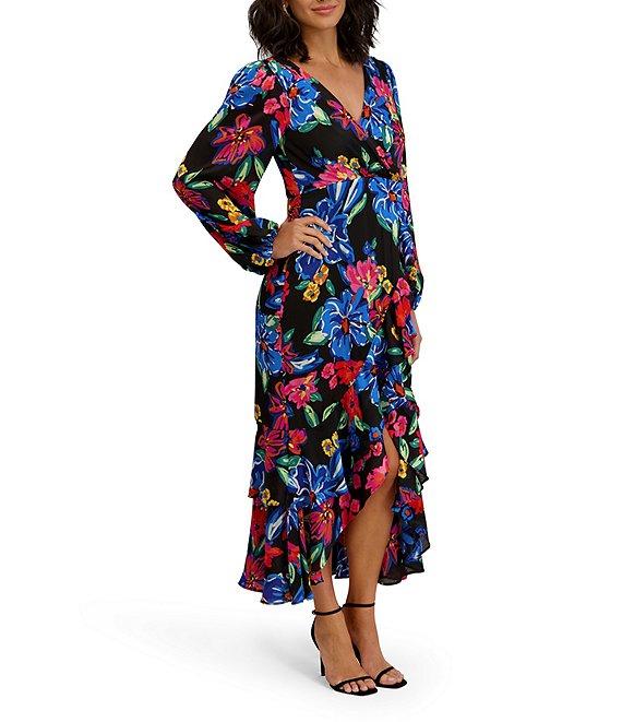 Kensie Long Sleeve Floral Chiffon Embroidered Mesh High Low Dress