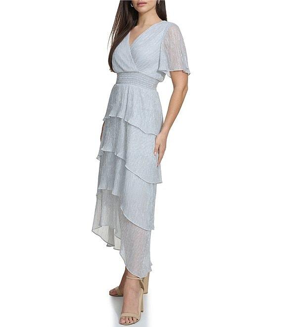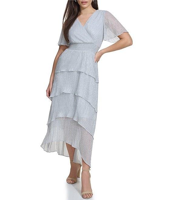 Kensie Metallic V-neck Short Flutter Sleeve Tiered High-Low Smocked Waist Tiered Dress