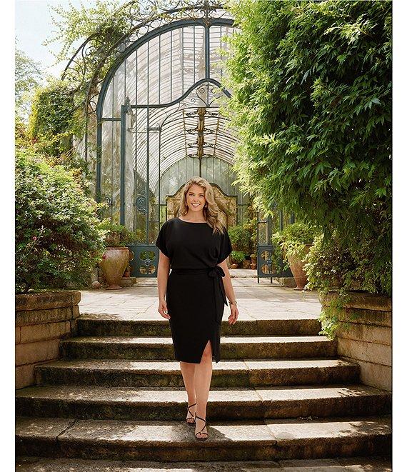 From Kensie Plus, this dress features: Crepe scuba fabrication Crew neckline Short sleeves Bow belt at waist Skirt hem slit Lined Bow detail Knee length Left side zipper Approx. 45.5" in length Polyester Hand wash/lay flat to dry Imported.