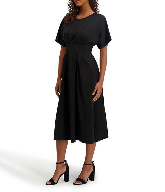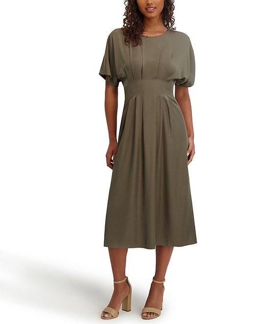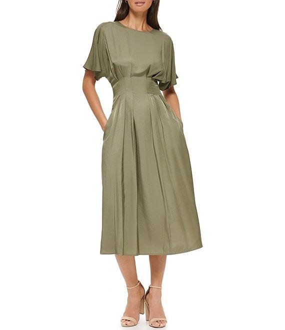 From Kensie, this dress features:a-line silhouetteCrew neckline short sleeveskeyhole detail at back of neck side seam pocketssmocked waistpleated front detail center back button with elastic loop closureapprox. 45.5" in length from shoulder to hempolyester/rayonhand wash Imported.