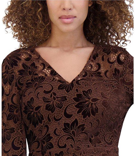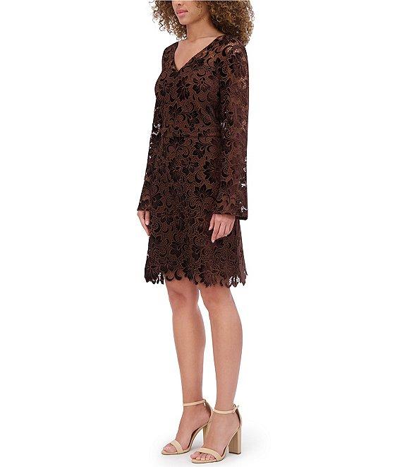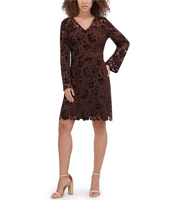 From Kensie, this dress features: Velvet lace fabrication V-neckline Long bell sleeves Back zip closure Approx. 28 1/4" back length Polyester Hand wash Imported.