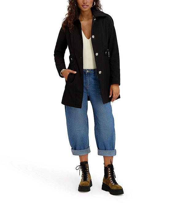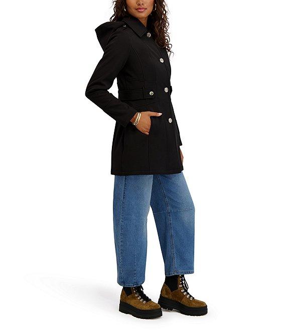 From Kensie, this coat features: Softshell fabrication Trench silhouette Point collar neckline Attached hooded Long sleeves Side seam pockets Water resistant Side tabs Gold accent button detail Slim fit Unlined Straight hemline Button front closure Polyester/spandex Machine wash Imported.