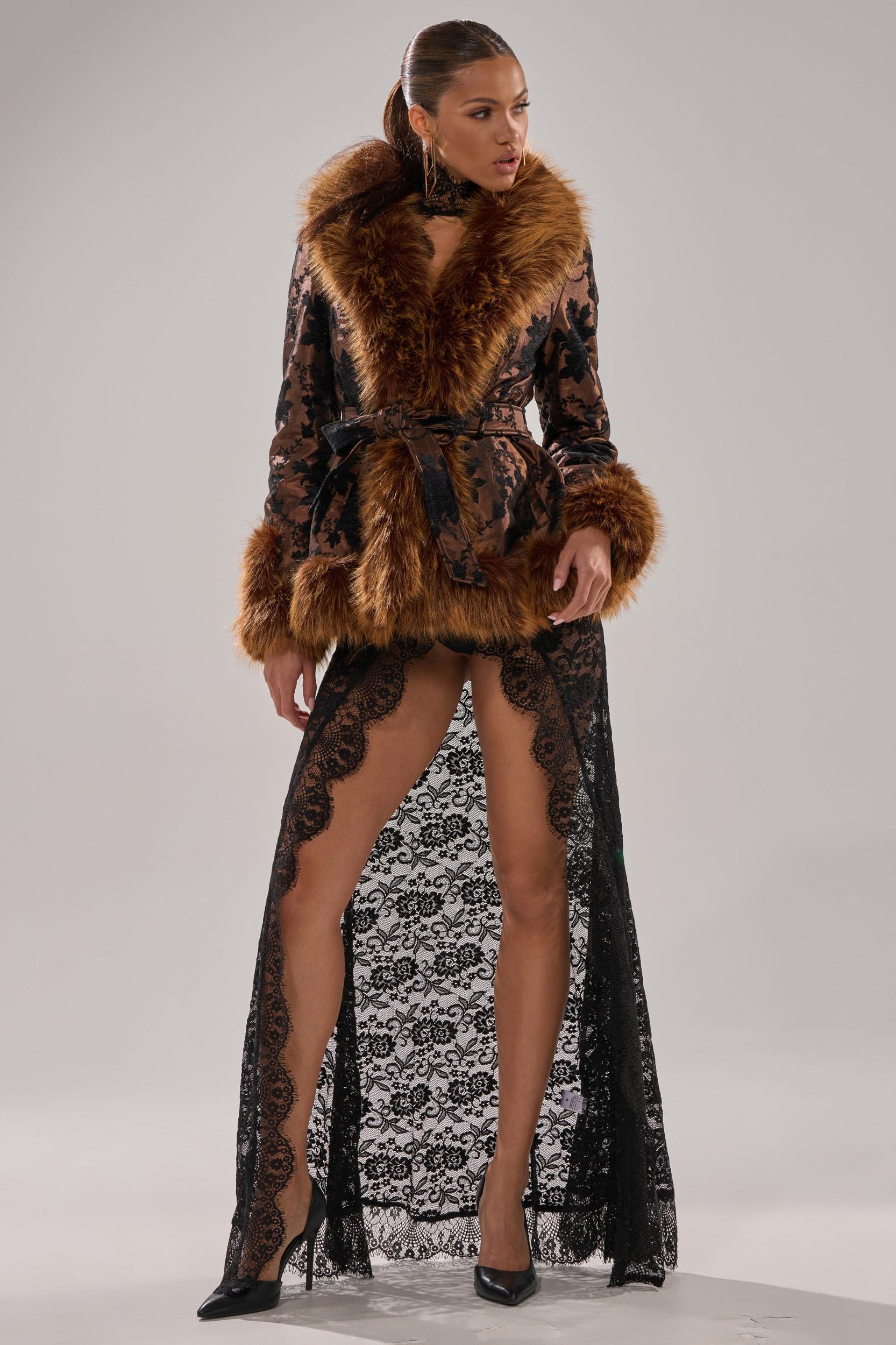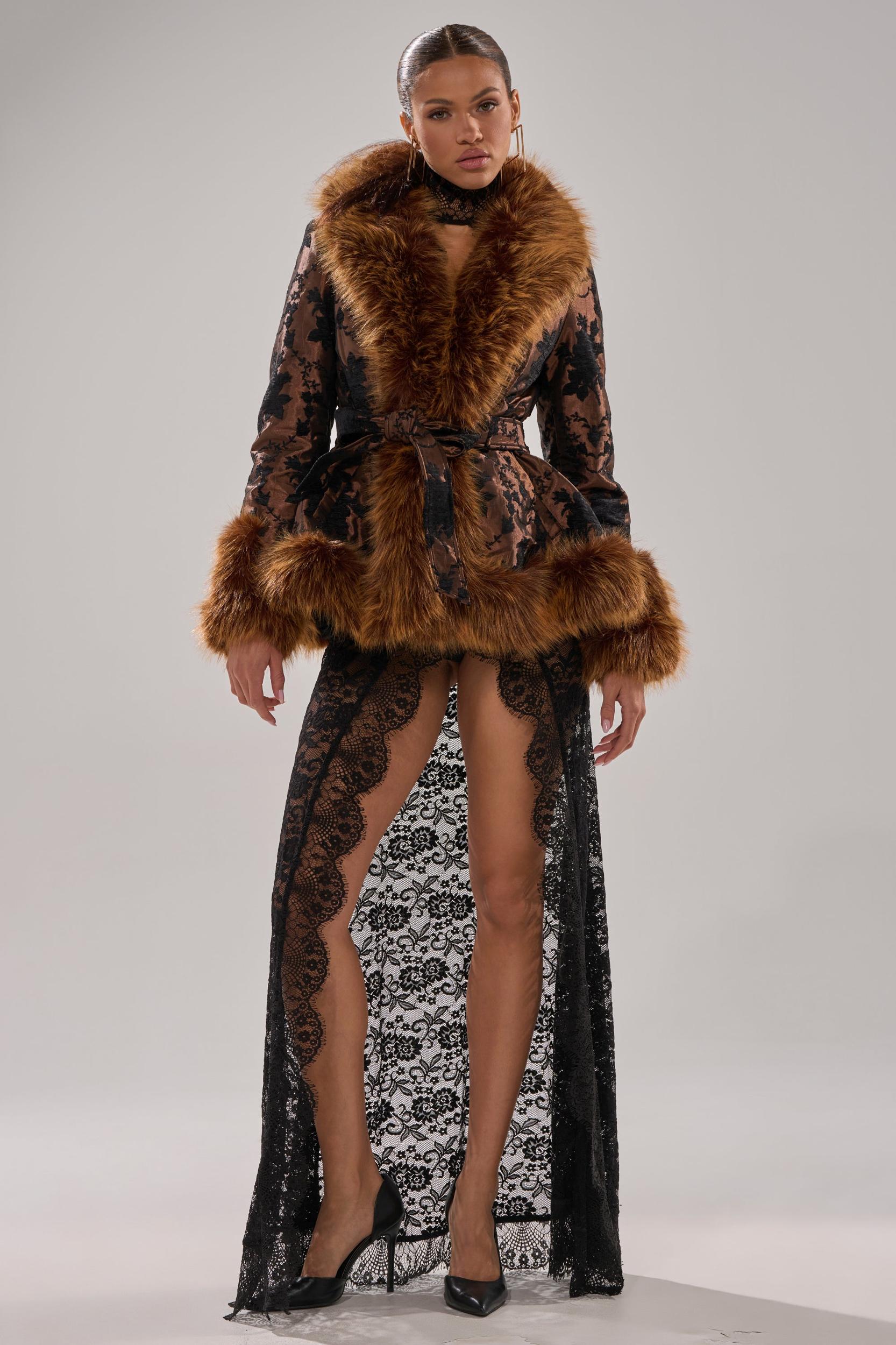 The AKIRA Label Kenzy Fur Trim Moto in Jacquard is crafted from a slick, lustrous base embroidered with an intricate, vintage-inspired floral pattern. It features a wide collar made from ultra-plush, fluffy faux fur that continues at the hemline and sleeve cuffs, spacious side slant pockets, and a coordinating self-tie belt for an hourglass silhouette. Complete with impossibly soft inner lining and concealed hook-and-eye front fastenings. - Main: 100% Polyester, Fur: 100% Polyester- Wipe Clean With Damp Cloth- No Stretch- Imported (all measurements approximate from size small)- 28” Shoulder to Hem- 15” Shoulder to Shoulder- 25” SleevesProduct ID: 1060458