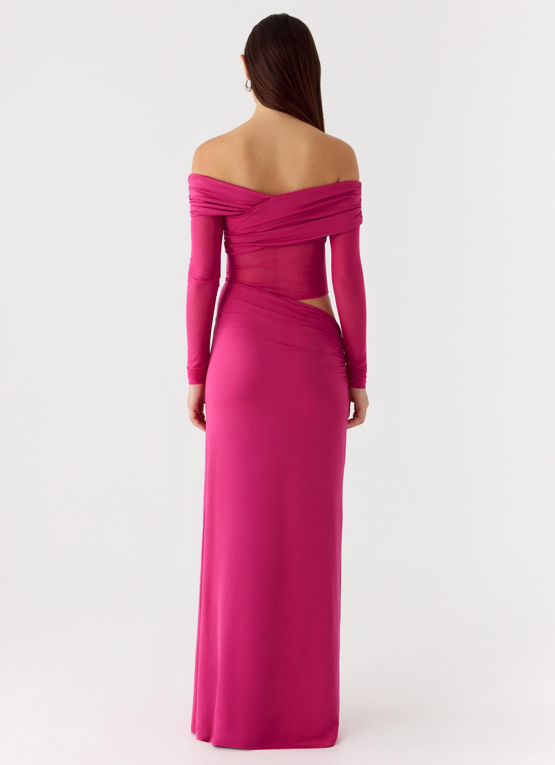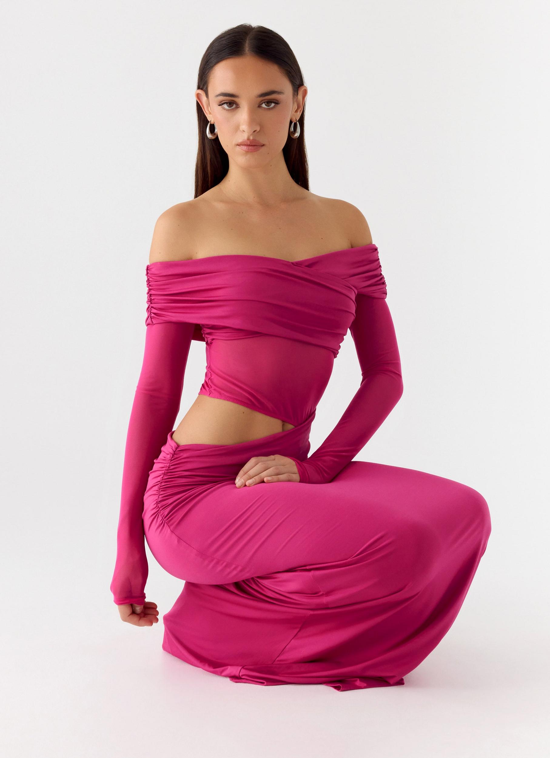 Peppermayo Exclusive The Kerli Maxi Dress is made for evenings that shimmer from golden-hour to after-dark elegance. Flowing into a maxi length with an off-the-shoulder wrap and side cut-out, this silhouette features a sheer bodice side for a subtly sultry finish. Fully lined for comfort and ease, it’s designed to move effortlessly with every step. - Maxi length- Off-the-shoulder wrap- Side cut-out- Bodice side sheer- Fully lined- Fabric: 95% Polyester, 5% Spandex Size AU 8 / US 4 garment measurements: Bust: 71 cm / 27.95 inWaist: 62 cm / 24.41 inHip: 79 cm / 31.10 inLength: 143 cm / 56.30 inHem: 146 cm / 57.48 inSleeve length: 65 cm / 25.59 in Roberta is 177cm and wears size AU 6 / size US 2