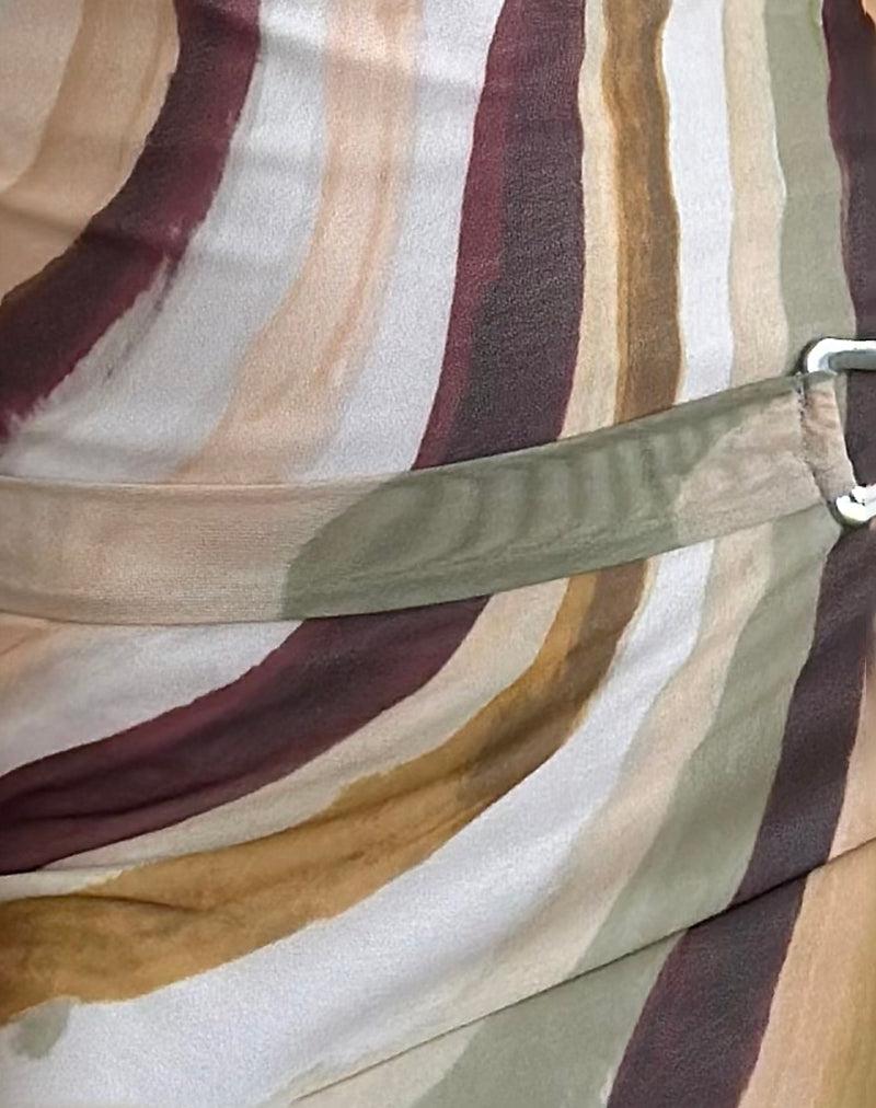 The Kevsra dress, a tube dress coming in a mini length, features panelling below the waist to create a flowy a line skirt finished with a side split and self fabric belt around the low waist with a silver belt loop, the dress is cut from a stretch mesh base printed with an abstract stripe in neutral tones. MODEL WEARS SIZE: SMALL - MODEL HEIGHT:5'8