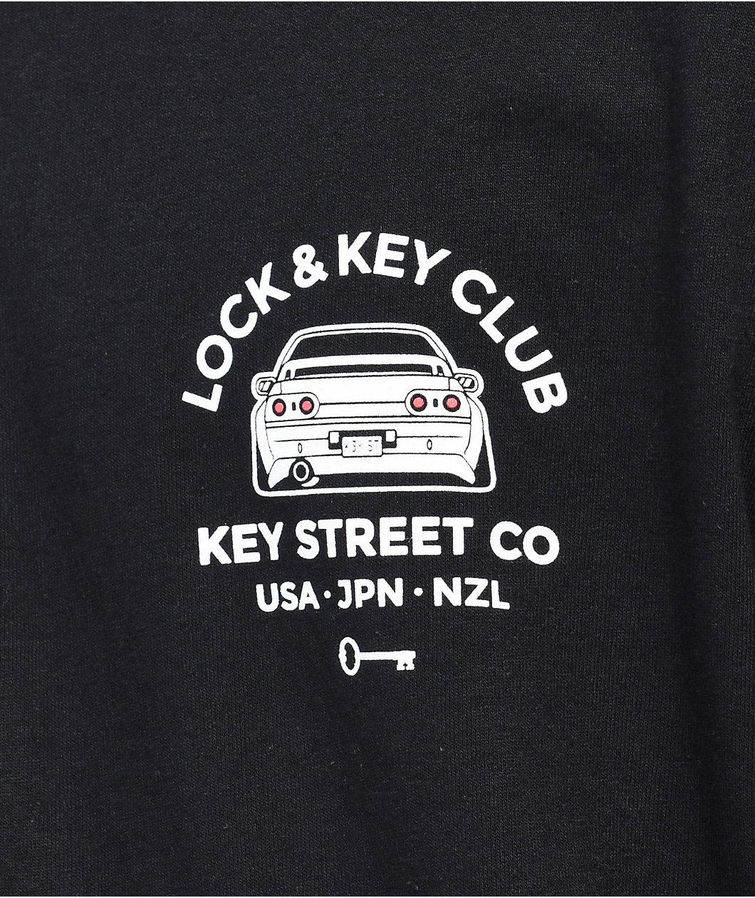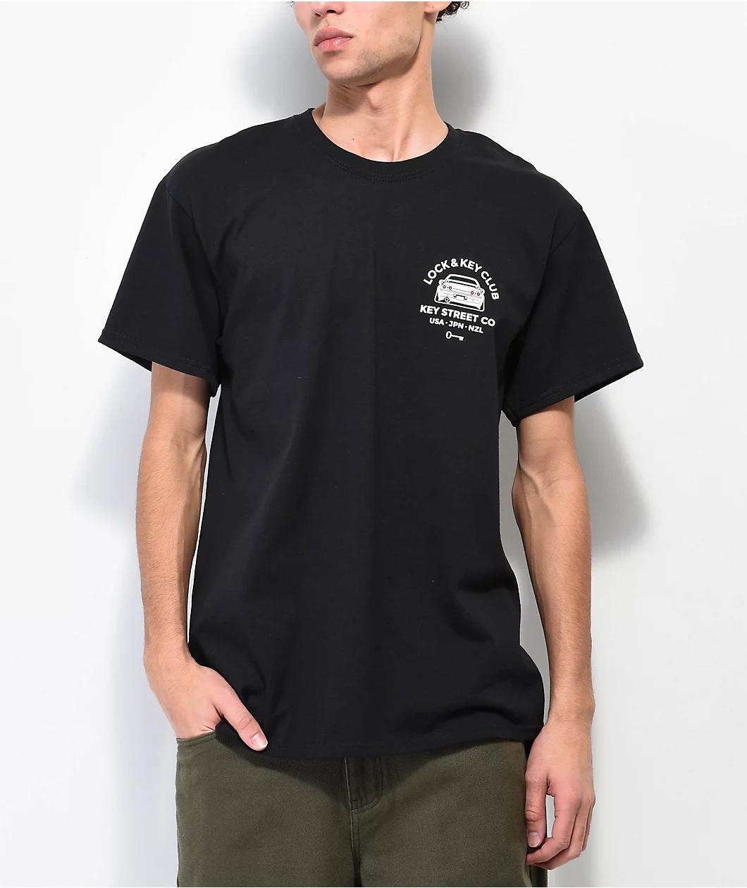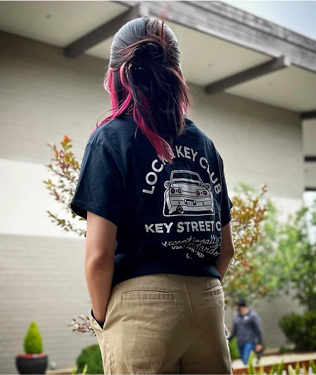 The Car Club t-shirt from Key Street comes in a black colorway, taking inspiration from street racing around the world. The tail of a JDM car is printed on the left chest and back, with "Lock & Key Club | Key Street Co. | USA JPN NZL" messaging throughout