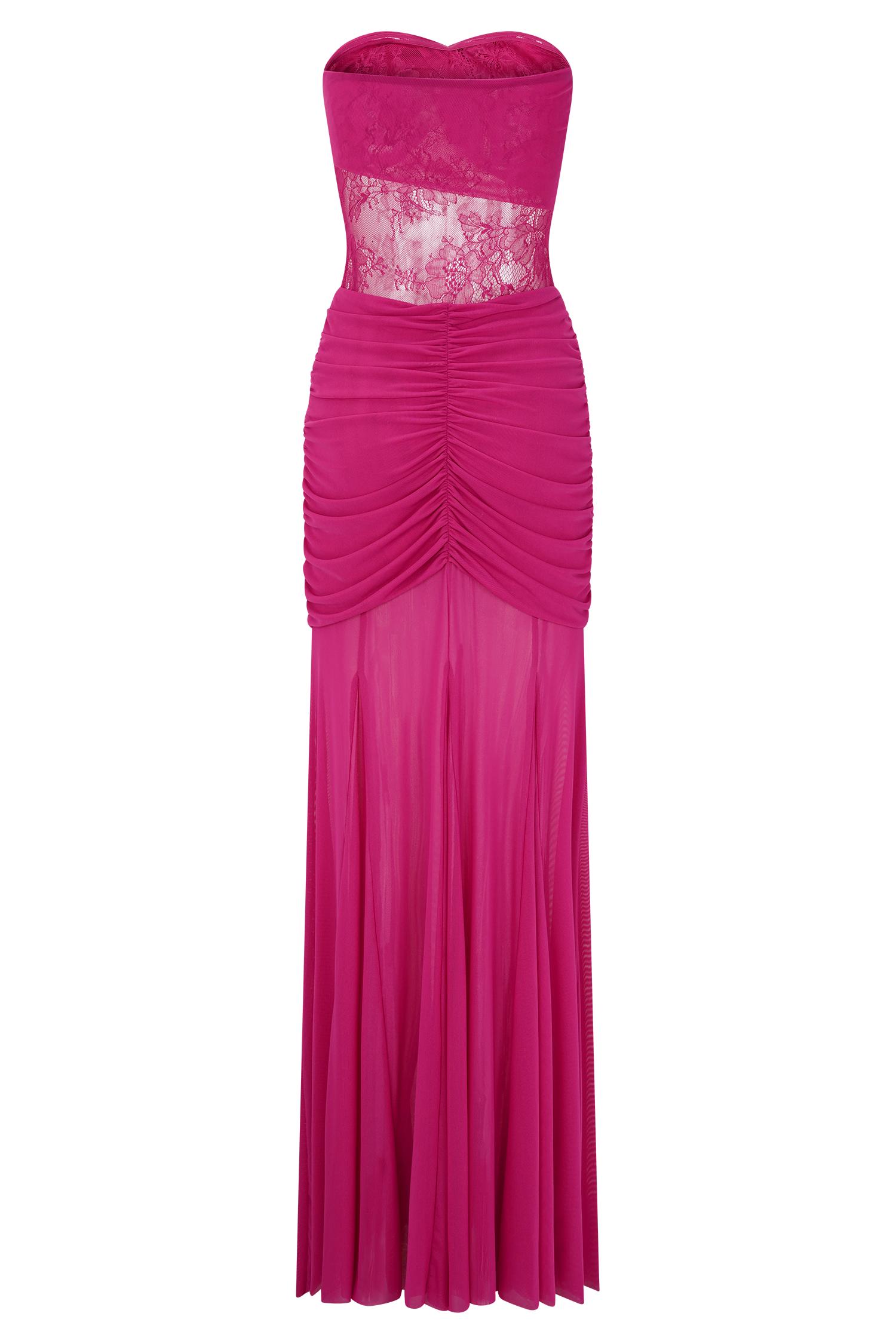 Evenings made memorable. The KHADIJAH Lace and Mesh Maxi Dress is a romantic showstopper designed to captivate. Featuring a strapless neckline with a twisted, gathered bust detail, this silhouette highlights the figure with a delicate lace panel bodice and a softly gathered waist. The voluminous mesh skirt adds graceful movement, creating a beautiful contrast to the fitted upper half. Partially lined for coverage with a hint of sheerness, this dress is the perfect choice for special occasions, formal evenings, or moments that call for effortless enchantment.