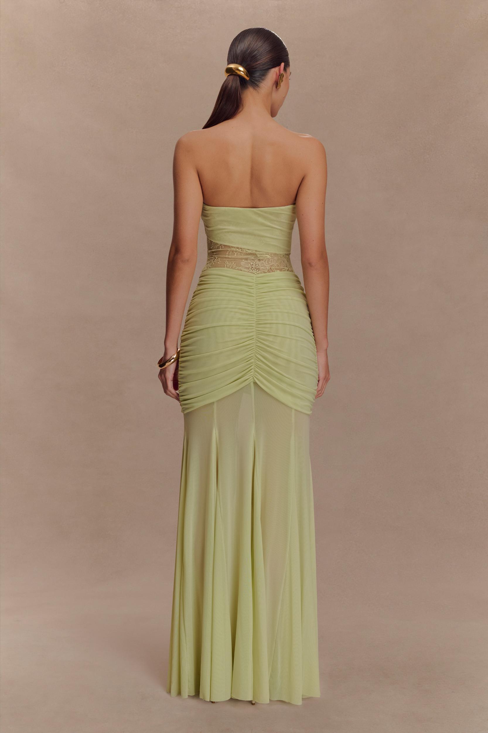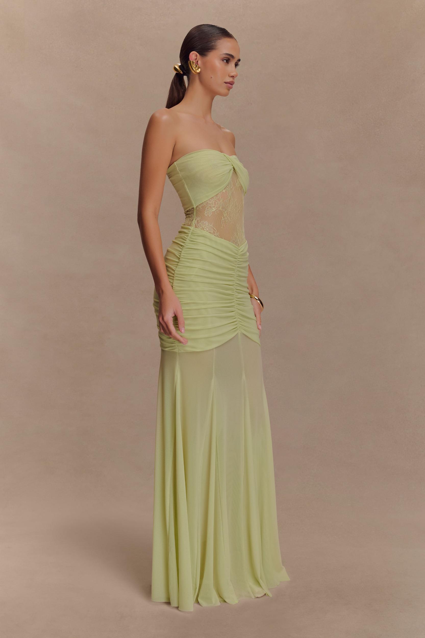 Evenings made memorable. The KHADIJAH Lace and Mesh Maxi Dress is a romantic showstopper designed to captivate. Featuring a strapless neckline with a twisted, gathered bust detail, this silhouette highlights the figure with a delicate lace panel bodice and a softly gathered waist. The voluminous mesh skirt adds graceful movement, creating a beautiful contrast to the fitted upper half. Partially lined for coverage with a hint of sheerness, this dress is the perfect choice for special occasions, formal evenings, or moments that call for effortless enchantment.