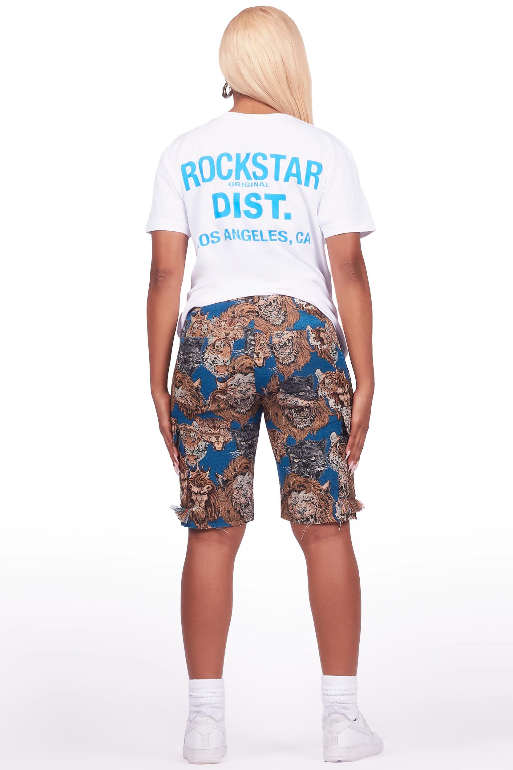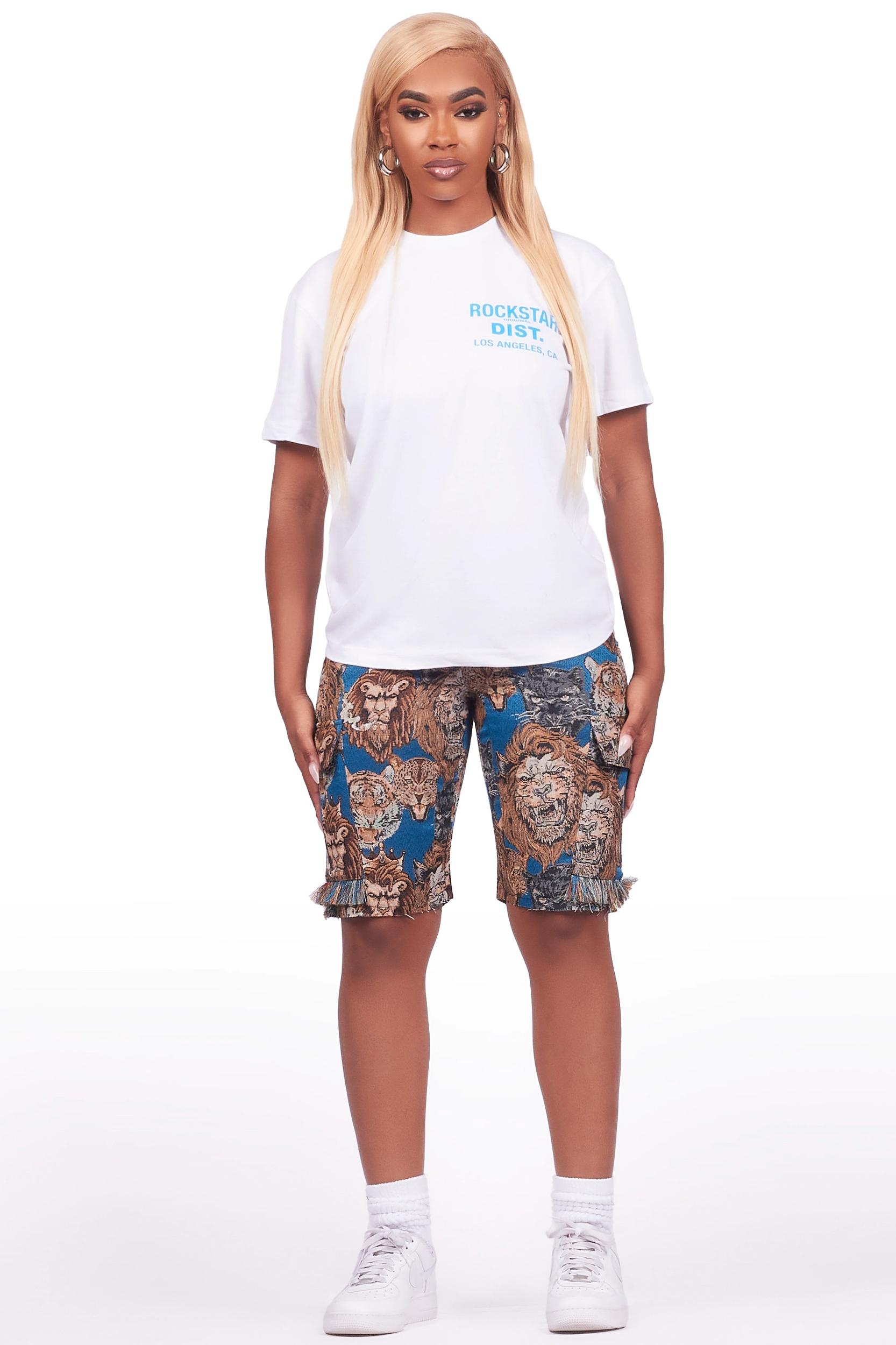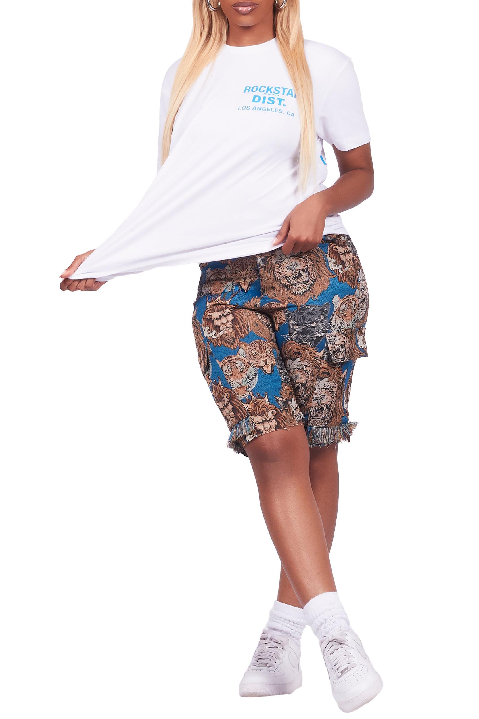 An urban two-piece tee and denim tapestry cargo short set for women. Designed with organic cotton and custom detailing for an essential everyday set. Crew neckline Short sleeves Pullover style Relaxed-fit Printed RSO graphics Zip fly with button closure Mid-rise waist line 6-pocket build Custom woven tapestry designing Deconstructed hem Figure-framing silhouette Barrel-leg trousers