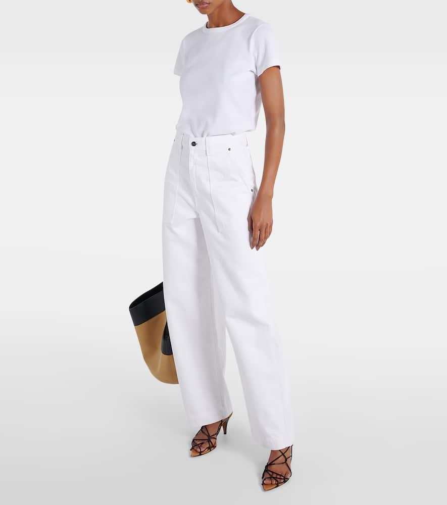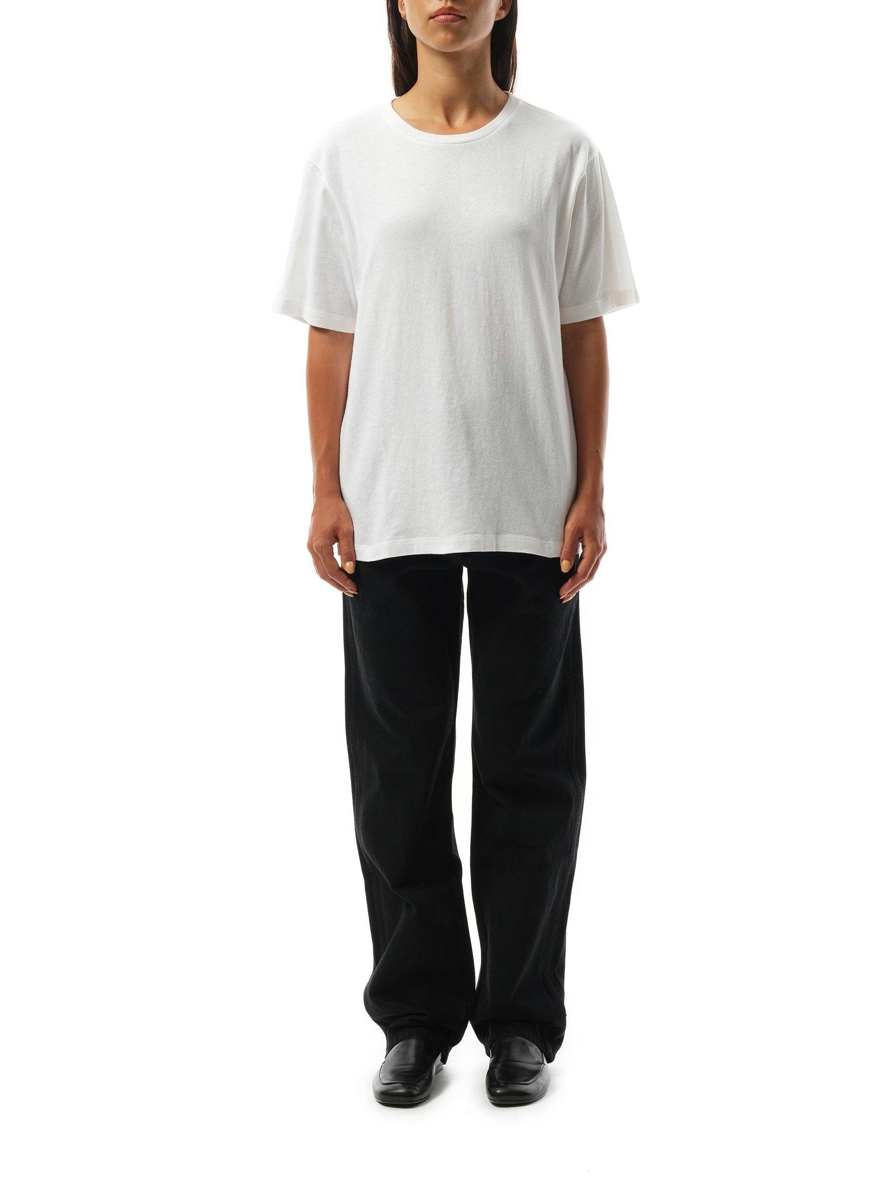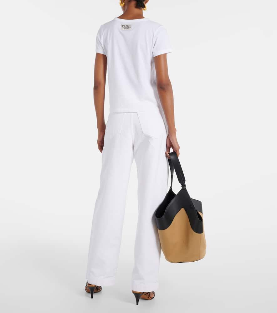 Shop Khaite Womens White Mae Brand-patch Cotton-jersey T-shirt In Cream from 800+ stores, starting at $150. Leave it to KHAITE to make something as understated as a T-shirt feel elevated. This 'Devra' style is cut for a boxy fit from cotton-blend jersey and has a subtle V-neckline and oversized sleeves. Style it with slick leather pants and point-toe boots for date night.