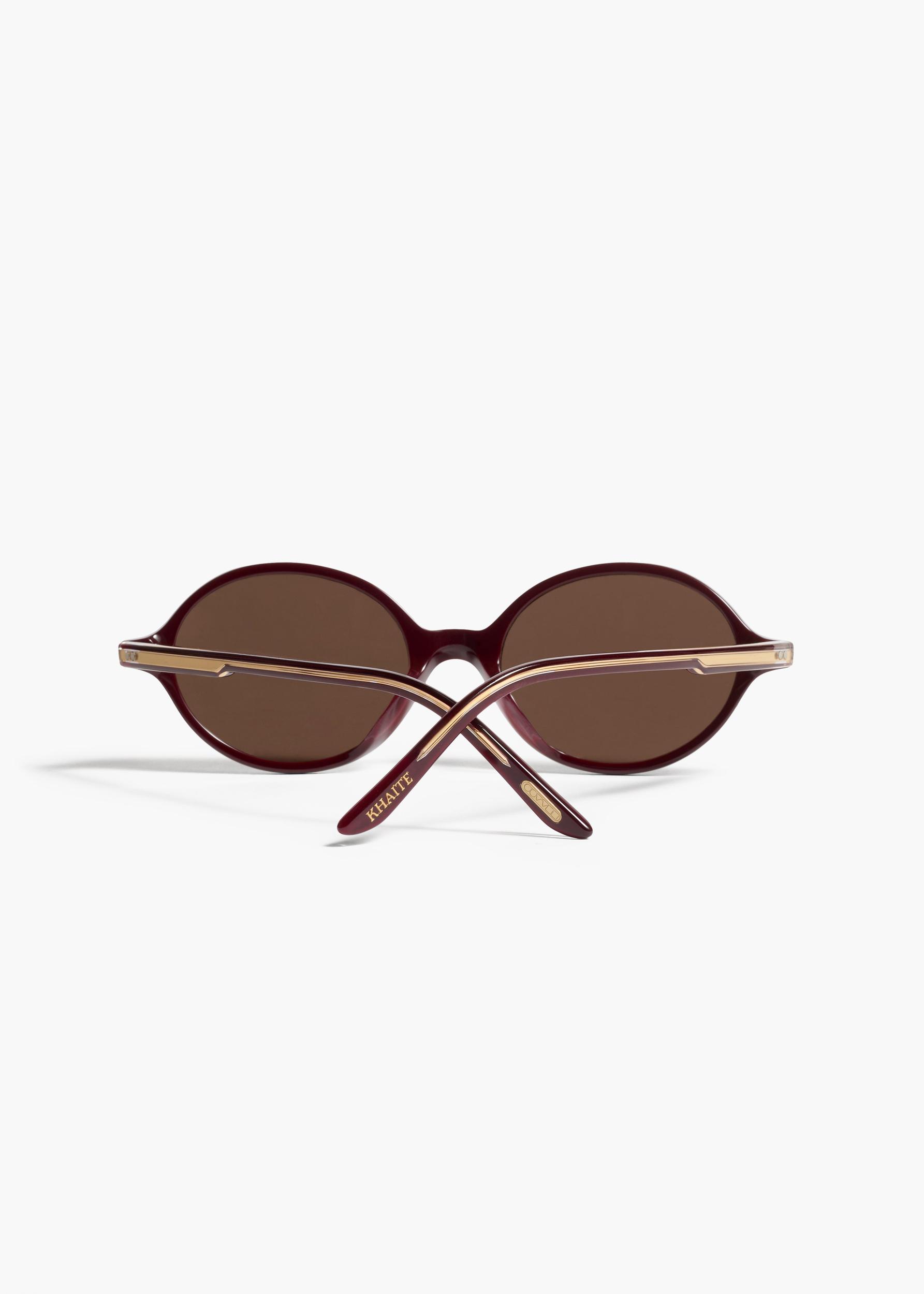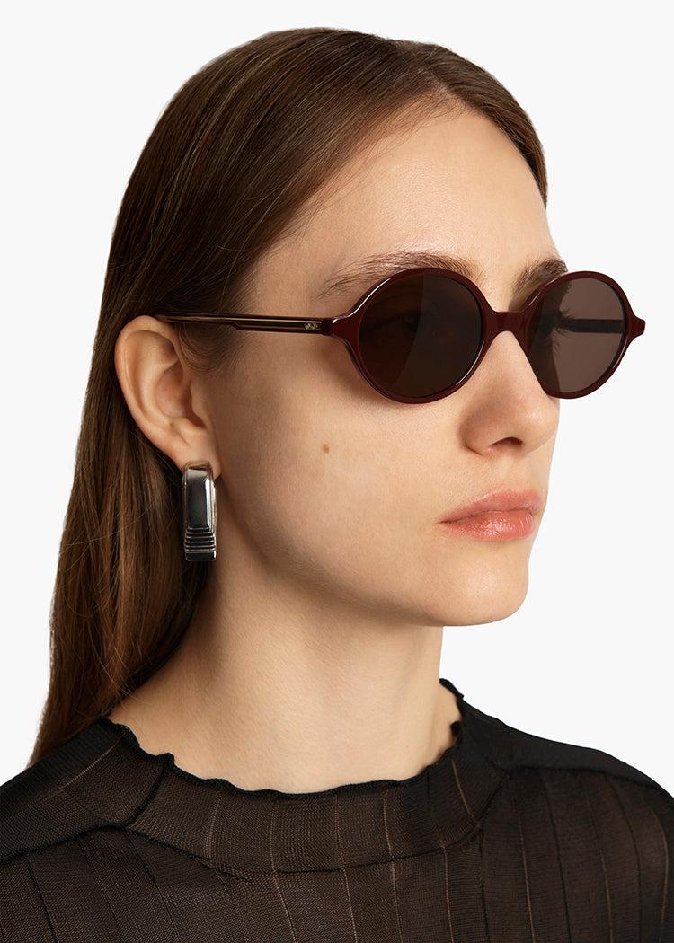 In collaboration with Oliver Peoples, the vision of KHAITE extends to eyewear. Handcrafted in Italy, these sunglasses embody serene audacity. The well-rounded silhouette looks to the turn of the twenty-first century. Tipped with alternating logos, the temples feature shooting corewire inspired by the hardware of KHAITE handbags. Each pair includes a signature lipstick red case and a drawstring pouch that doubles as a lens cloth.