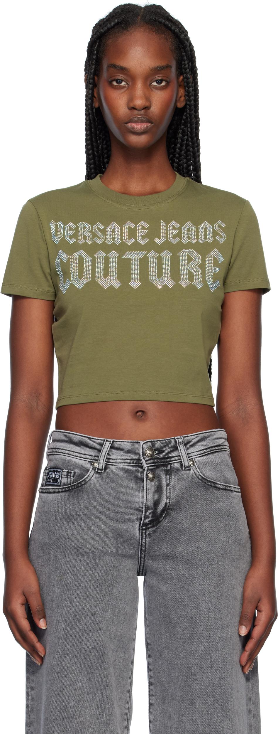 Khaki Crystal Gothic Logo Crop T-shirt