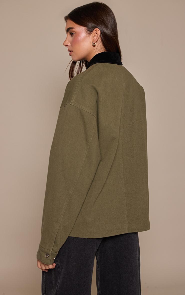 Own the utilitarian trend in the khaki pu contrast collar pocket detail jacket. This relaxed khaki jacket features a sharp pu collar and practical flap pockets. Ideal for effortless, confident daywear. Pair with dark pants, classic ballet flats, and gold earrings.Length approx 48.5cm/19inch (Based on sample size S)Model wears size SModel Height - 5ft 7inchp]:!mb-4inch>Brand: PrettyLittleThingCategory: OuterwearProduct type: JacketColor: KhakiMaterial: TwillOccasion: Day