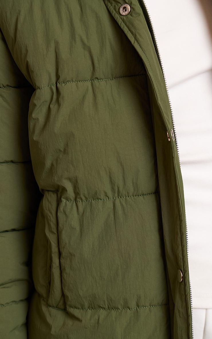 Mastering cold-weather style is effortless with the right foundation. This khaki hooded puffer jcket redefines practical layering for day plans, boasting a confident, relaxed cut with an integrated hood and a robust placket that features chic snap button fastenings, concealing a secure zip. Discreet side pockets add essential functionality to its modern silhouette. Team this versatile piece with tailored wide-leg pants or dark-wash denim and a fitted knit sweater for a balanced profile. Complete the ensemble with a pair of chunky boots for an assured stride, then add understated accessories for a polished, on-brand finish.Length approx 48.5cm/19inch (Based on sample size US 4)Model wears size UK 8/ EU 36/ AUS 8/ US 4Model Height - 5ft 10inchp]:!mb-4inch>Category: OuterwearProduct type: PufferColor: KhakiMaterial: ShellOccasion: Day