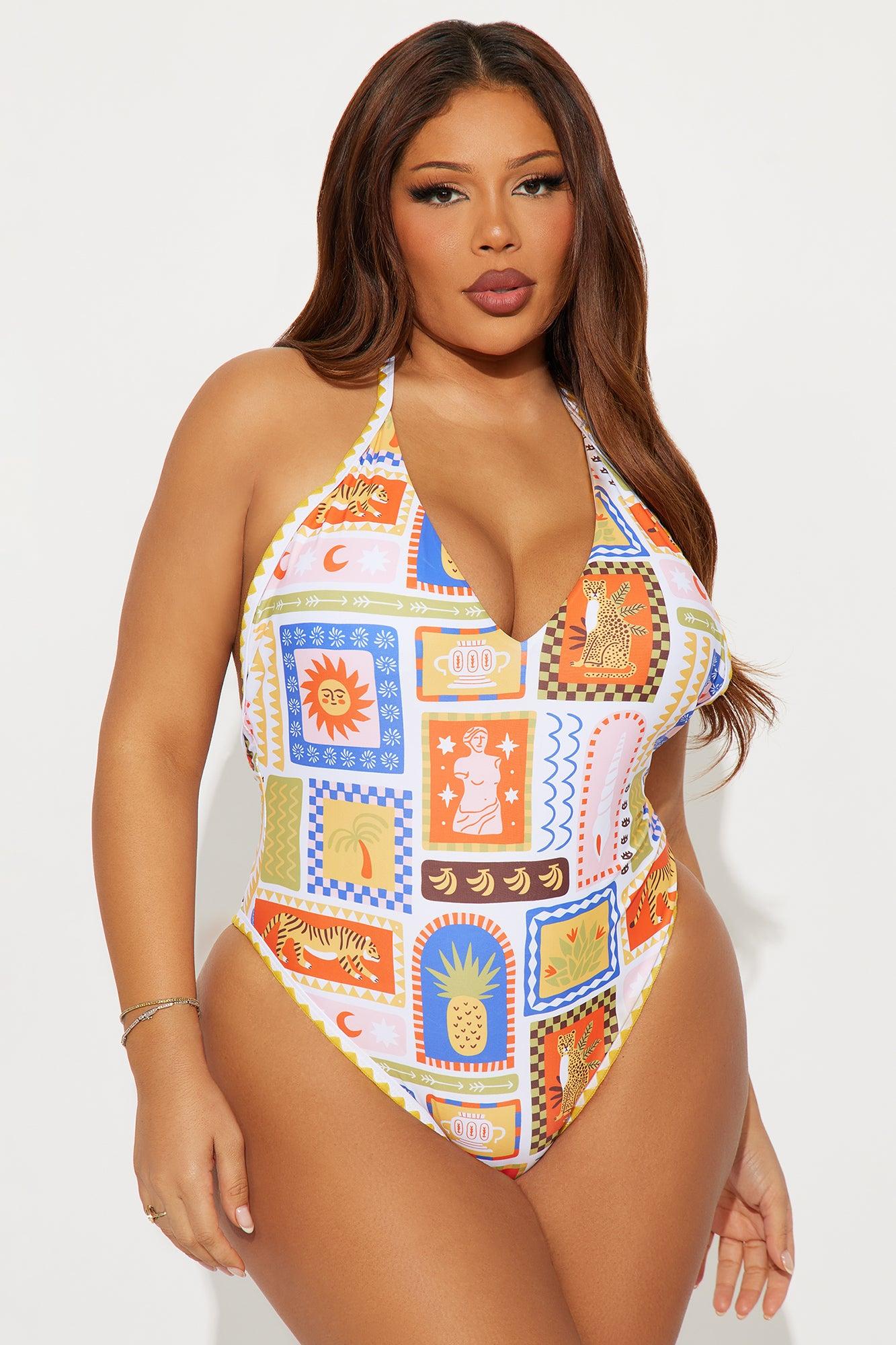 Available In Yellow/combo. Backless 1 Piece Swimsuit Coastal Tie Print Halter Neck Ties Deep V-Neck Removable Cups Shelf Bra High Leg Cut Contrast Thread Detail Full Stretch Final Sale Disclaimer: Print Placement May Vary Shell: 82% Polyester 18% Spandex Lining: 90% Polyester 10% Spandex Imported
