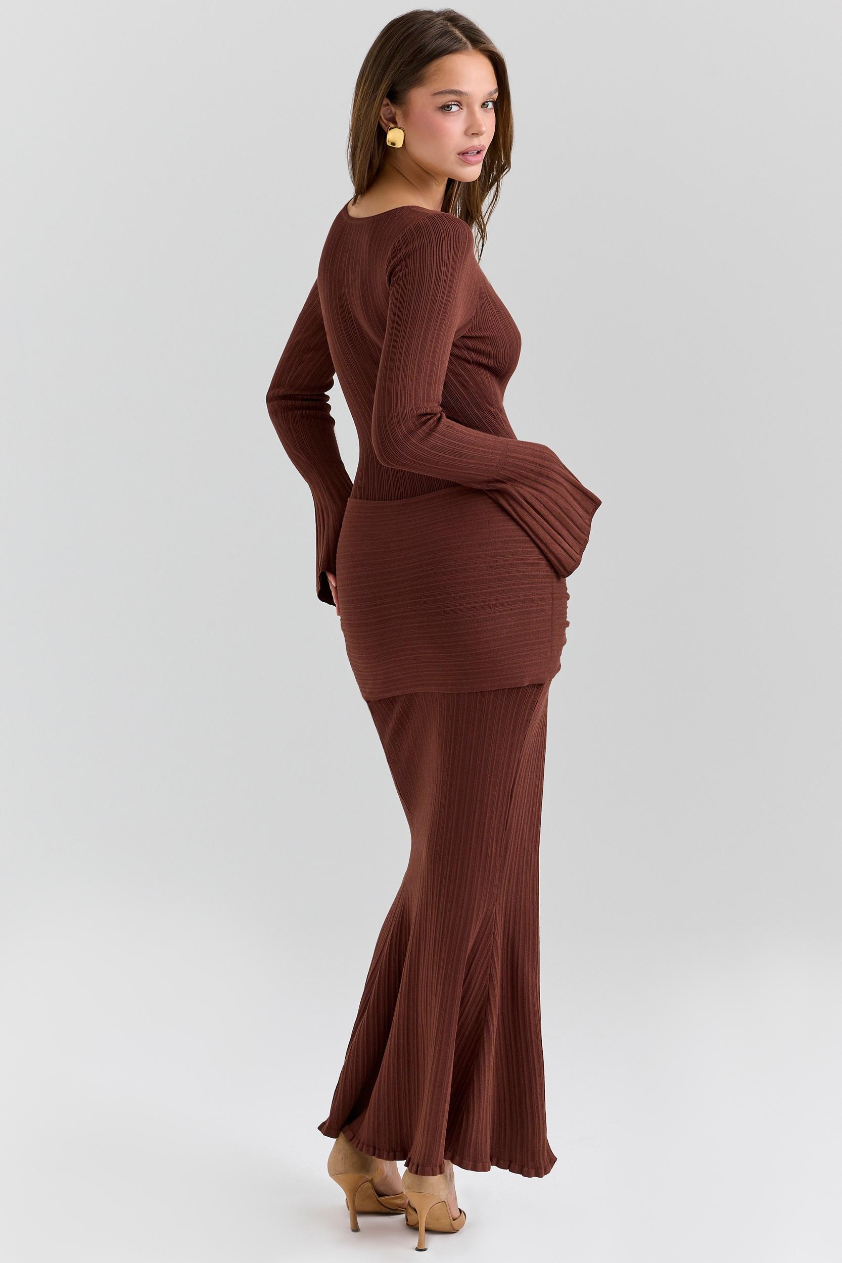 Draped to perfection, we're into 'Khrysta's' vibe – cool, contemporary, but with that classic HOCB fit. The lightweight knit fabric is expertly cut to a maxi length with a beautiful V-neckline and long sleeves that are slightly fluted at the end. The skirt features a flattering twist across the hips and a sultry side split that shows off just the right amount of leg.