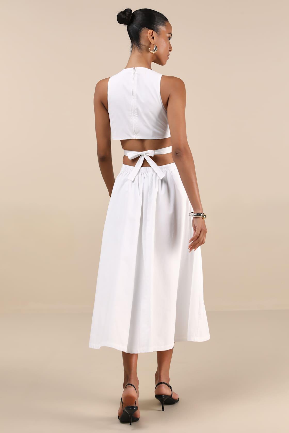 A chic twist on the classic sundress, this lightweight woven cotton midi will have you frolicking through the season in trend-setting style. The sleeveless silhouette boasts a crew neckline and a gathered waist with flirty wrapping side cutouts and long sashes that tie across the back, all atop a flowy A-line skirt. Hidden zipper/clasp and elastic at back.