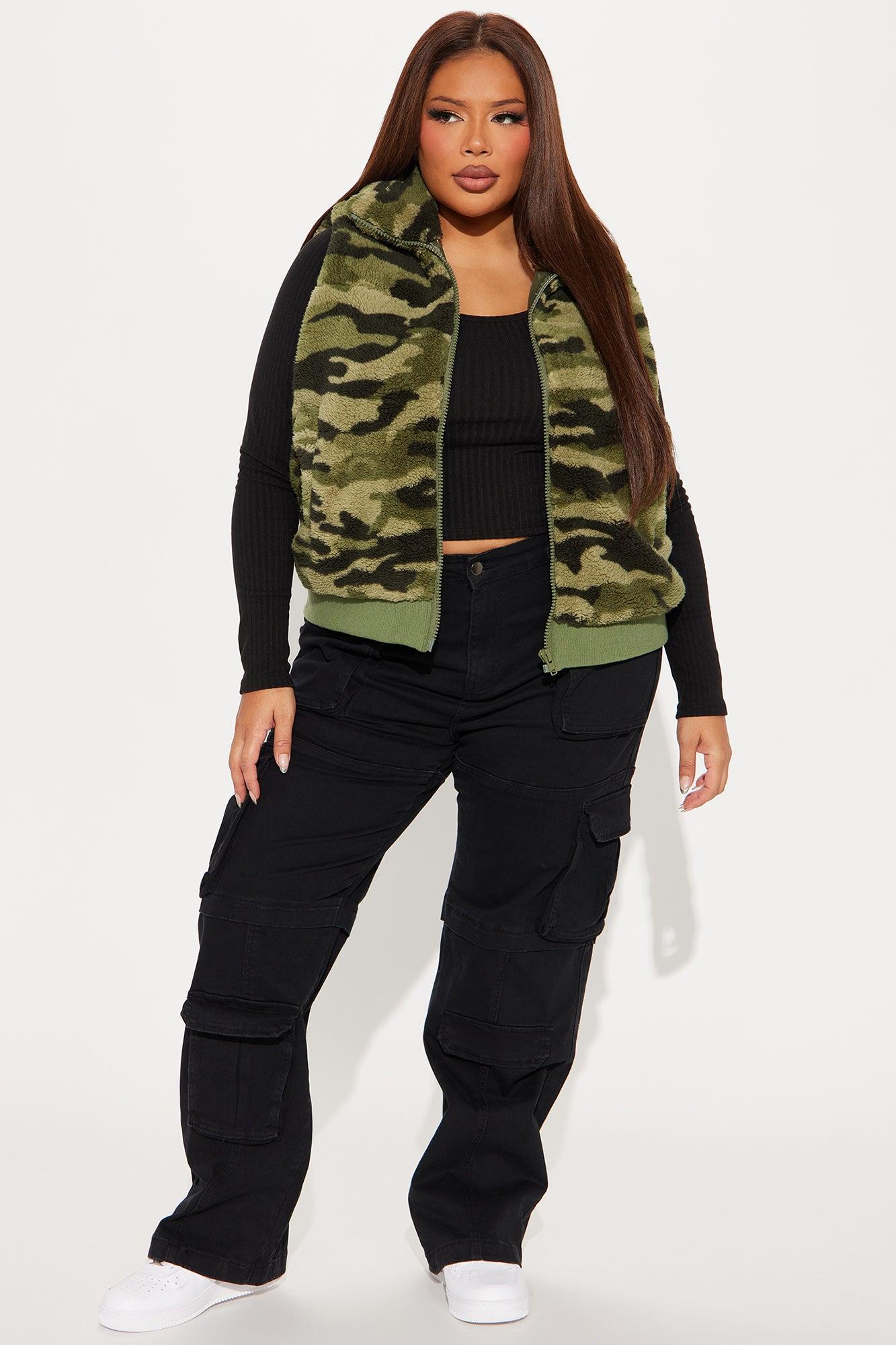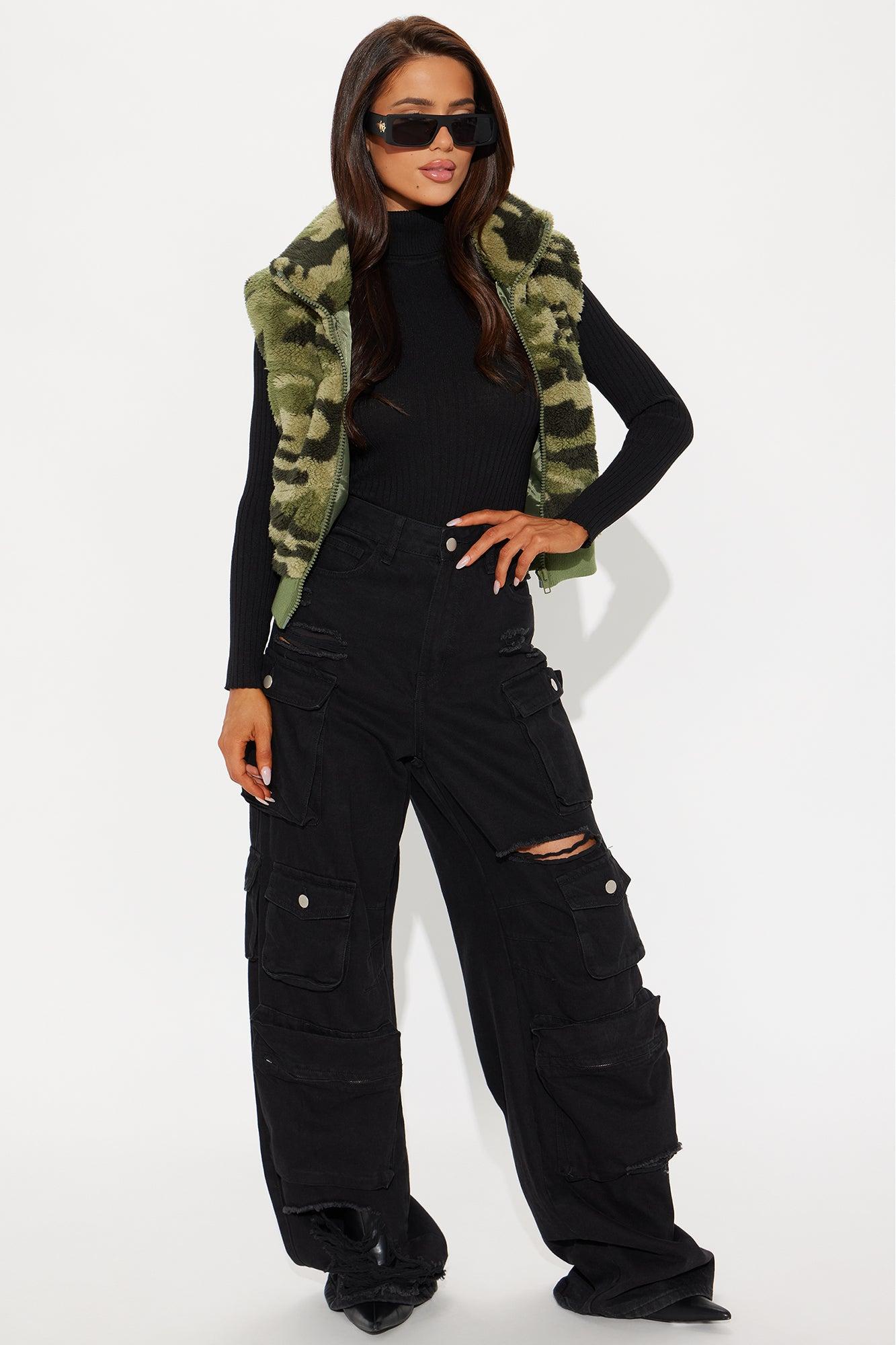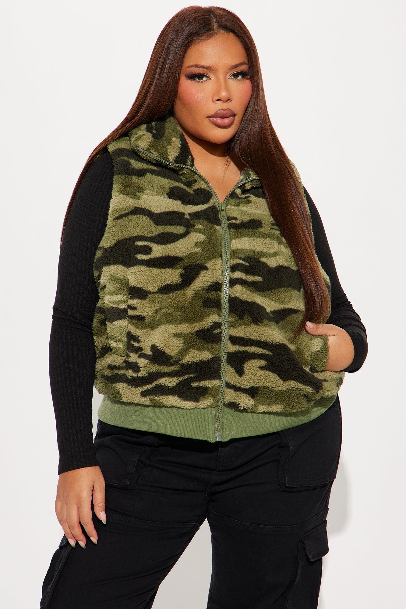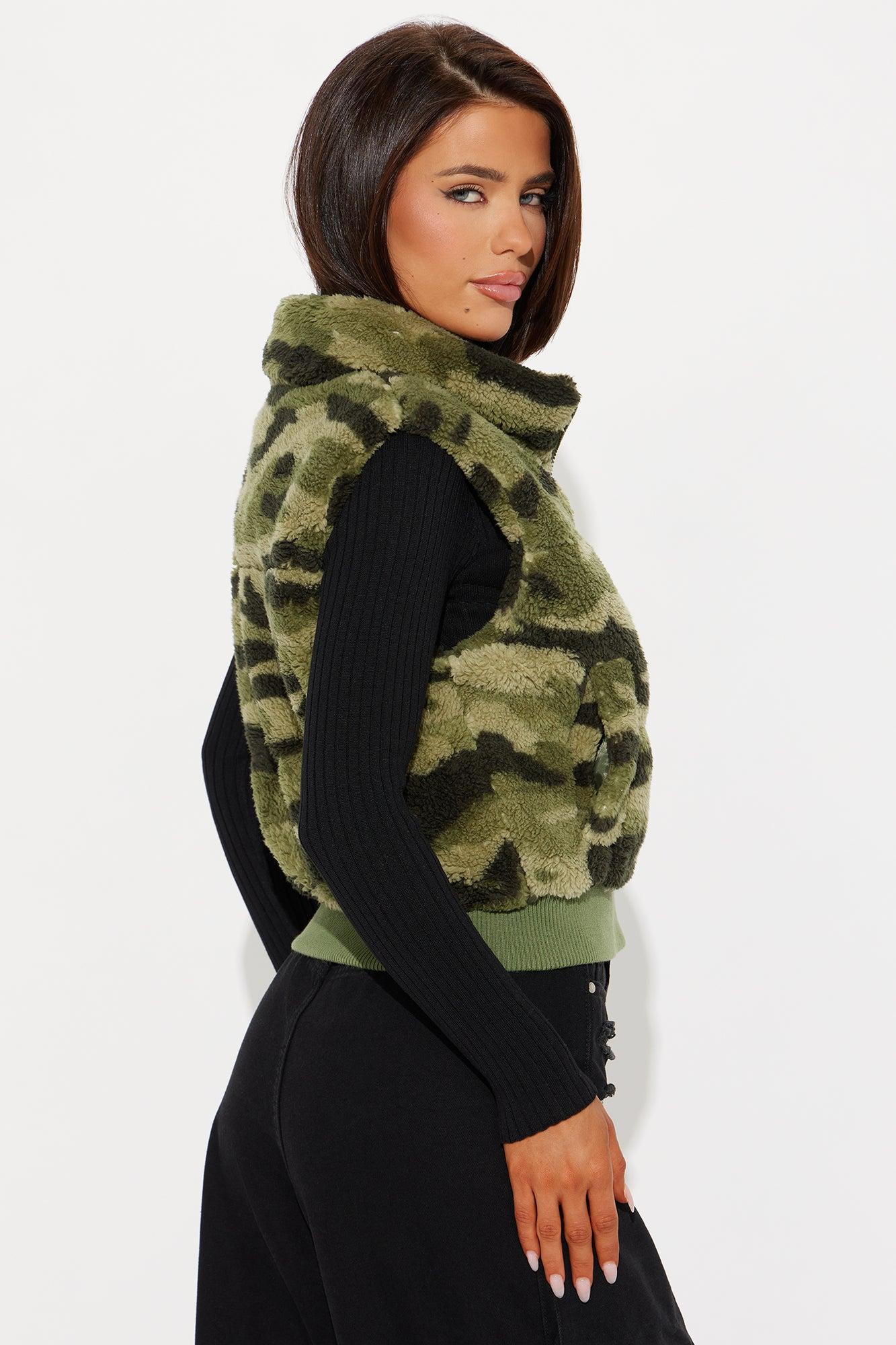 Kiara Sherpa Printed Puffer Vest - Olive/combo