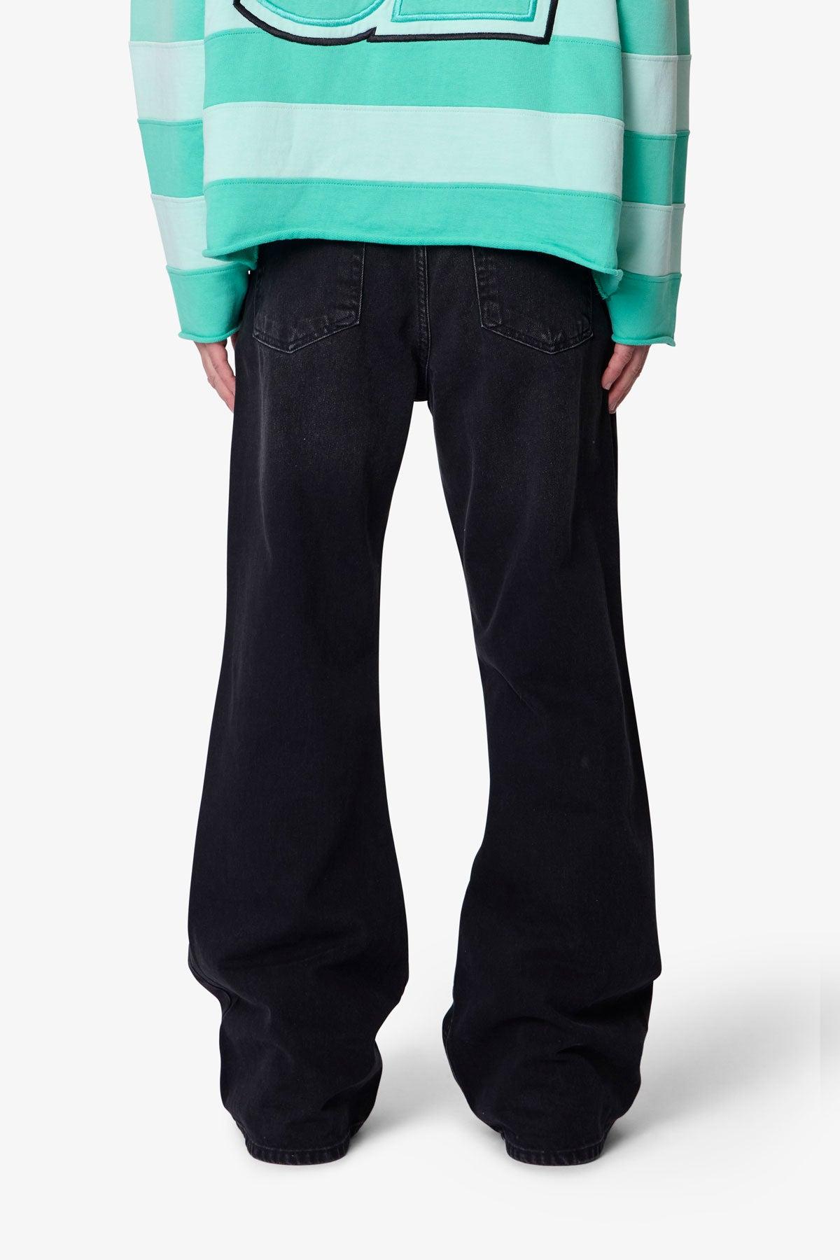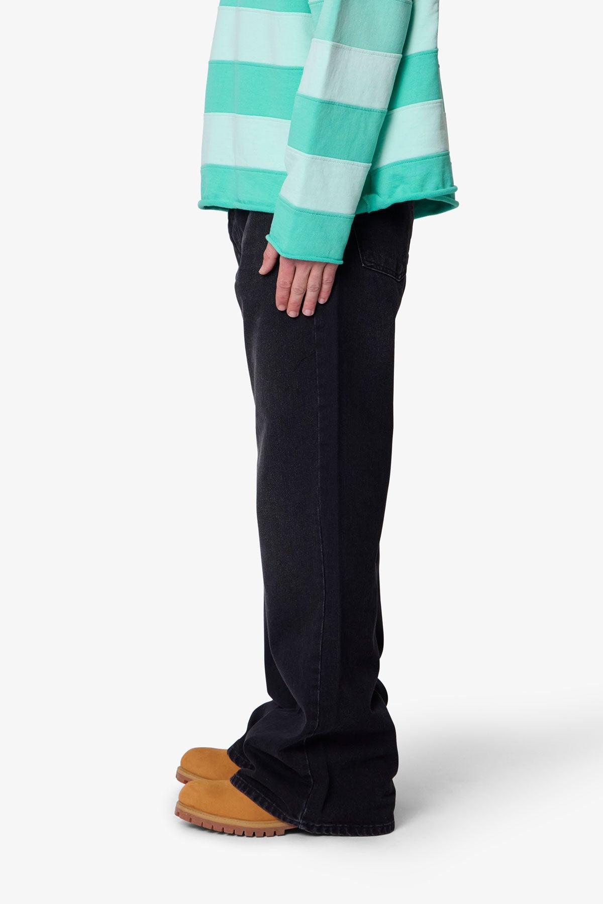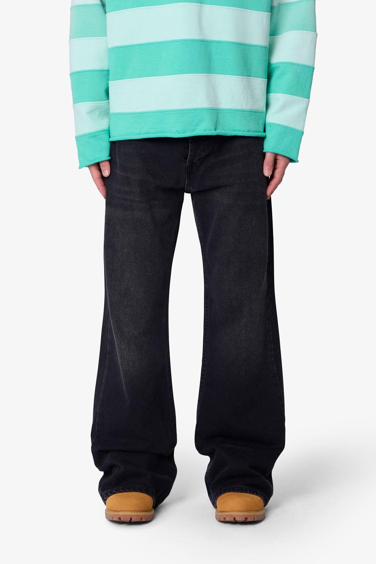 The Kick Flare Denim features a relaxed bootcut fit with a roomy thigh and knee, finished with an exaggerated wide leg opening for a flared silhouette. Made from 100% cotton denim with whiskering and sanding details, it includes a standard 5-pocket layout, button fly, and finished hem. details Relaxed bootcut fit 100%