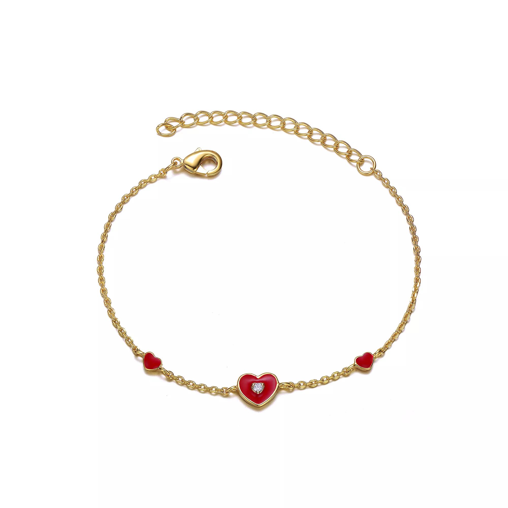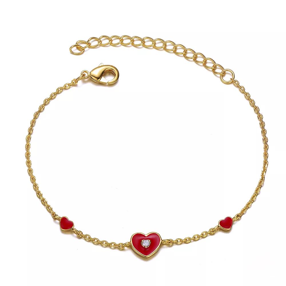 Give your childs jewelry box a sweet refresh with this enamel and cubic zirconia-accented 14k gold plated heart station bracelet. Click on this JEWELRY & WATCHES GUIDE to learn about fit, styles, materials and more! Give your childs jewelry box a sweet refresh with this enamel and cubic zirconia-accented 14k gold plated heart station bracelet. Click on this JEWELRY & WATCHES GUIDE to learn about fit, styles, materials and more! FEATURES Length: 5 in. with 1-in. extender Clasp: lobster-claw Metal: brass Plating: 14k gold Finish: polished Packaging: velvety pouchSTONE DETAILS Stone type: cubic zirconia Gemstones may have been treated to enhance their appearance. Special care may be required. Please visit our Gemstone Treatment & Special Care Guide for more information. Gender: female. Age Group: adult.
