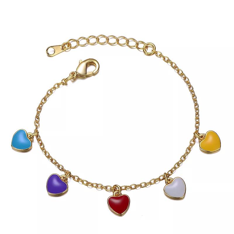 Add a pop of color to your childs jewelry box with this 14k gold plated multicolor heart charm bracelet. Click on this JEWELRY & WATCHES GUIDE to learn about fit, styles, materials and more! Add a pop of color to your childs jewelry box with this 14k gold plated multicolor heart charm bracelet. Click on this JEWELRY & WATCHES GUIDE to learn about fit, styles, materials and more! FEATURES Length: 5 in. with 1-in. extender Clasp: lobster-claw Metal: brass Plating: 14k gold Finish: polished Packaging: velvety pouch Gender: female. Age Group: adult.