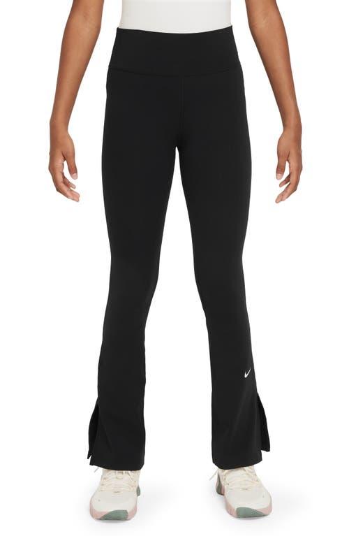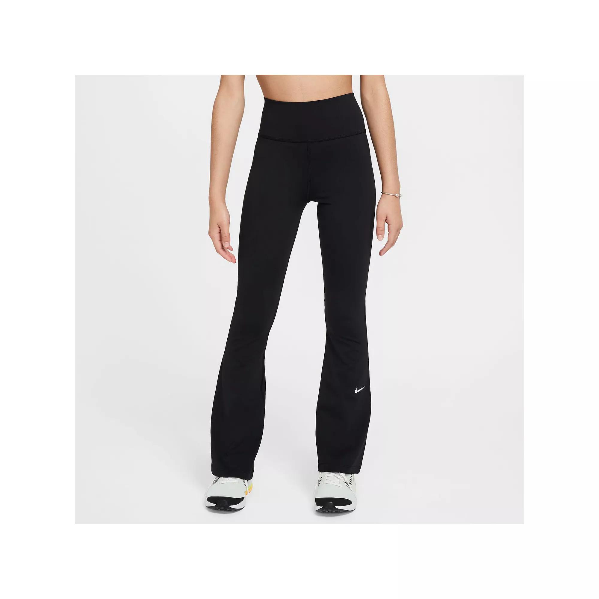 Busy days require clothes that can seamlessly take you from one activity to the next—just like our Nike One leggings. Their soft and stretchy fabric is supercharged with sweat-wicking technology, helping you stay dry and comfortable all day long. Plus, the high-waisted design helps keep you comfortably covered while a flared leg adds fun style. Benefits:Nike Dri-FIT technology moves sweat away from your skin for quicker evaporation, helping you stay dry and comfortable. High-waisted design helps keep you covered as you bend and stretch. Hidden pocket inside the back waistband provides storage for small essentials. Product Details:Body/Lining: 80% polyester/20% spandex. Machine wash. Imported. Style: FZ5609; Color: Black/White; Size: XL; Gender: Female; Age Group: Kids | Nike One Girls' Dri-FIT Flared Leggings in Black, Size: XL | FZ5609-010