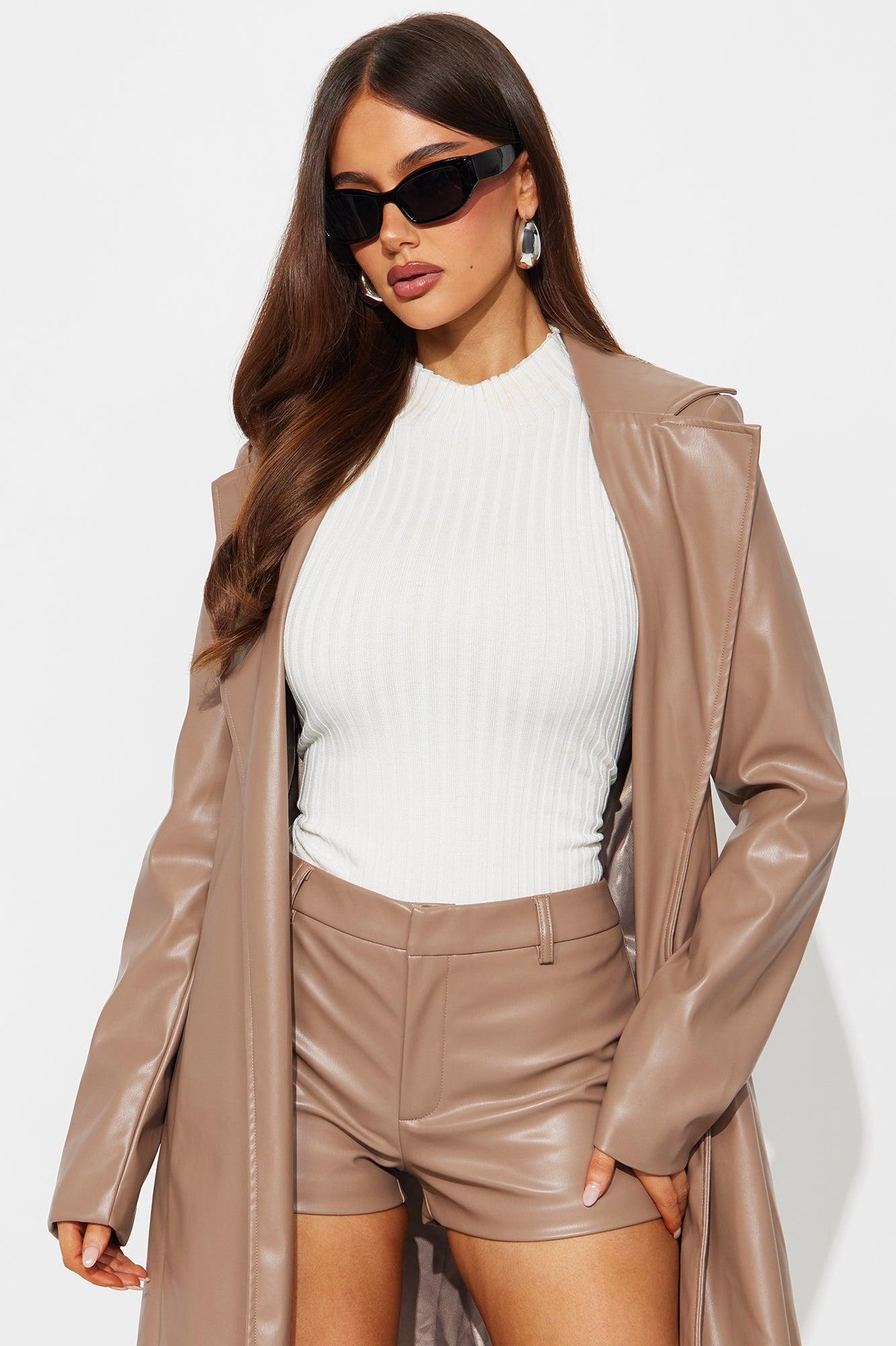Available In Mocha. 2 Piece Ensemble Faux Leather Trench Coat And Mini Short Set Stretch Fully Lined Shoulder Pads Waist Tie Invisible Back Zipper On Short Self: 50% Polyurethane 50% Polyester Lining: 100% Polyester Imported