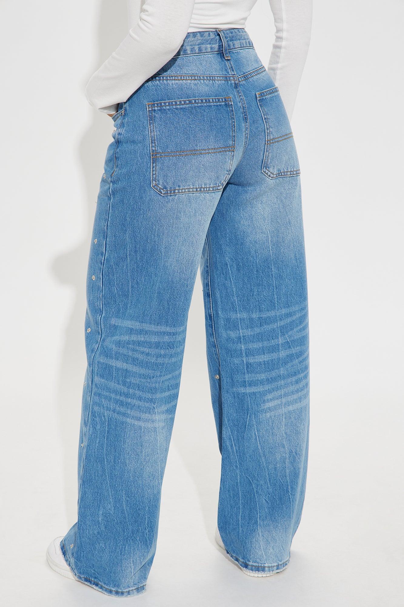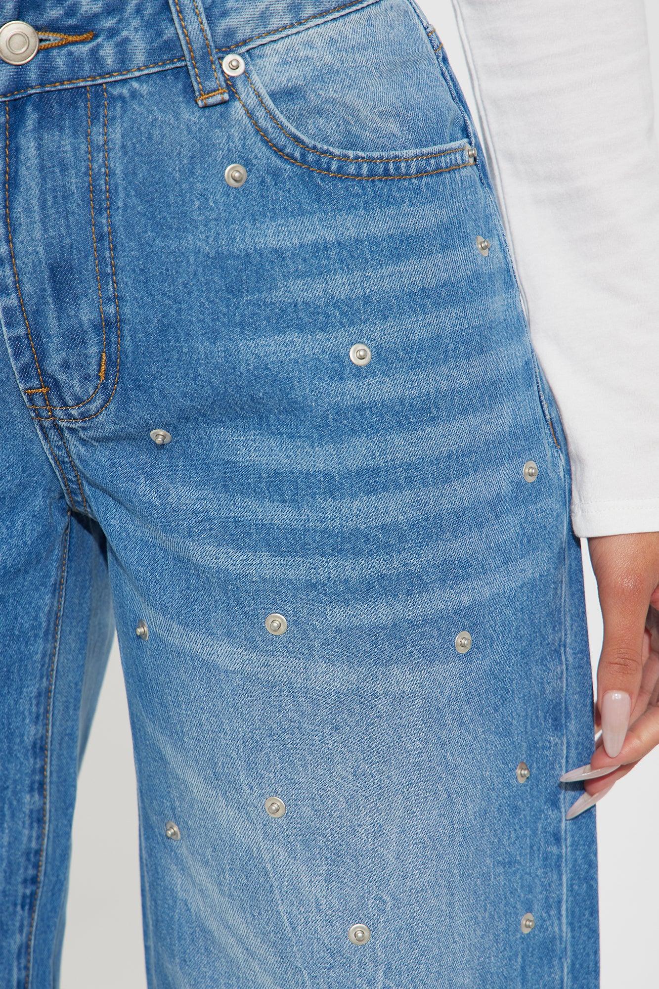 Available In Medium Wash. Wide Leg Jean 5 Pocket Embellished 10" High Rise 32" Inseam Disclaimer: Due To The Specialized Wash Process & Rivet Placement , Each Garment Is Unique. 59.5% Cotton, 40.5% Lyocell Non-Stretch Imported