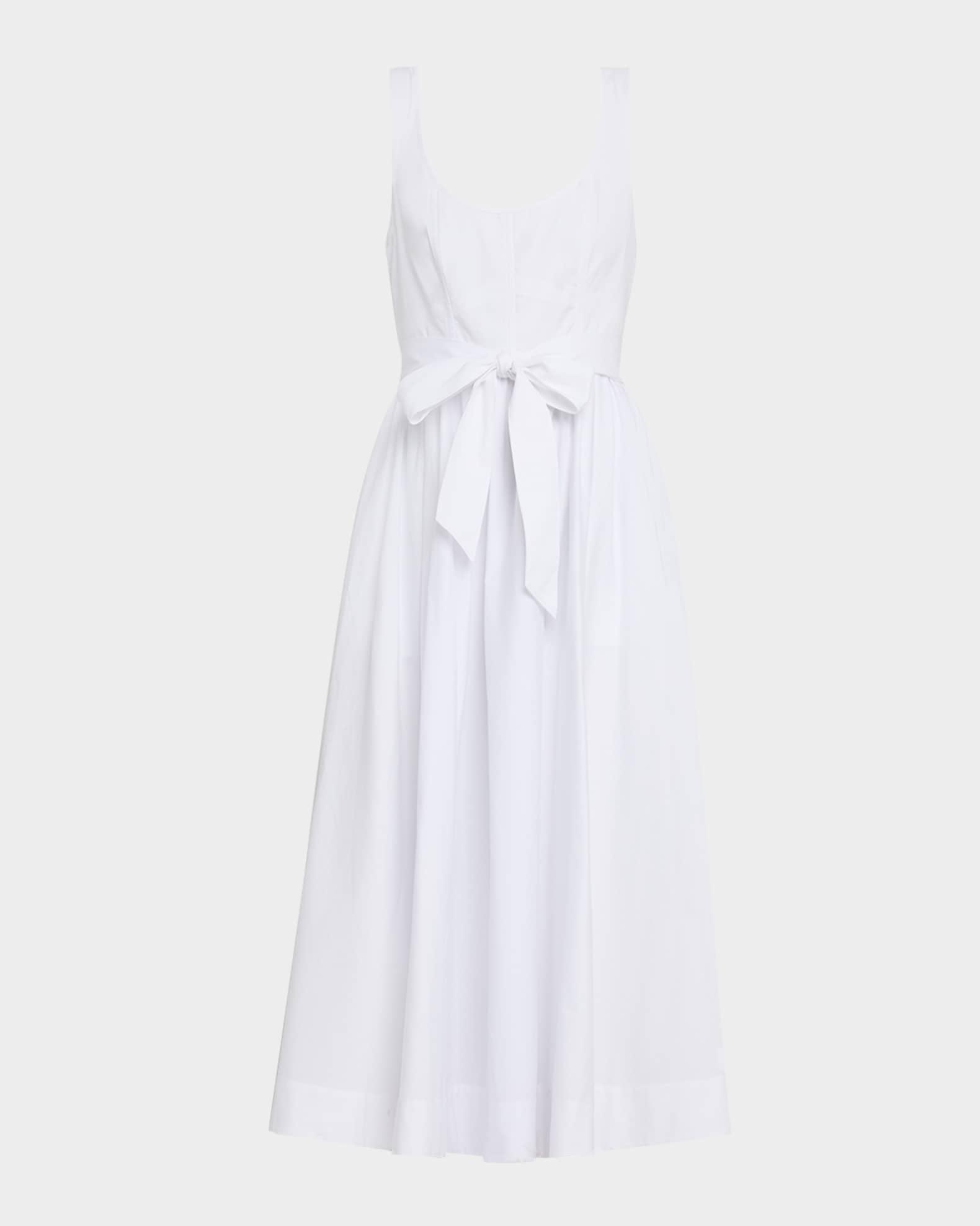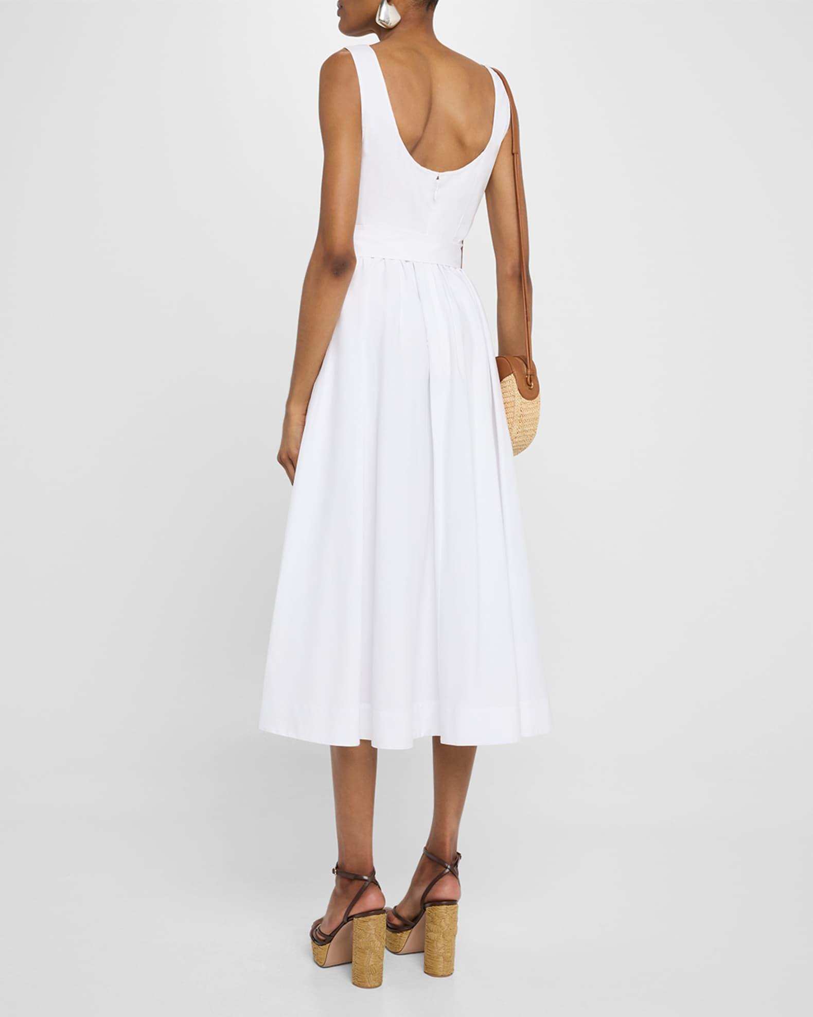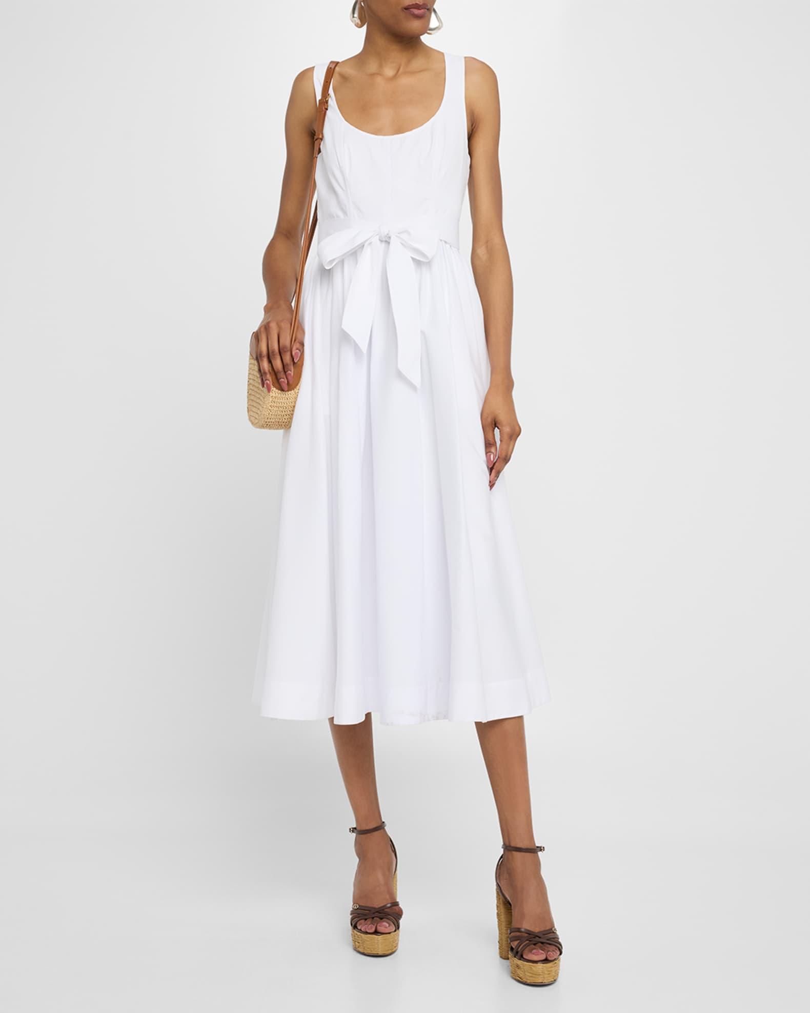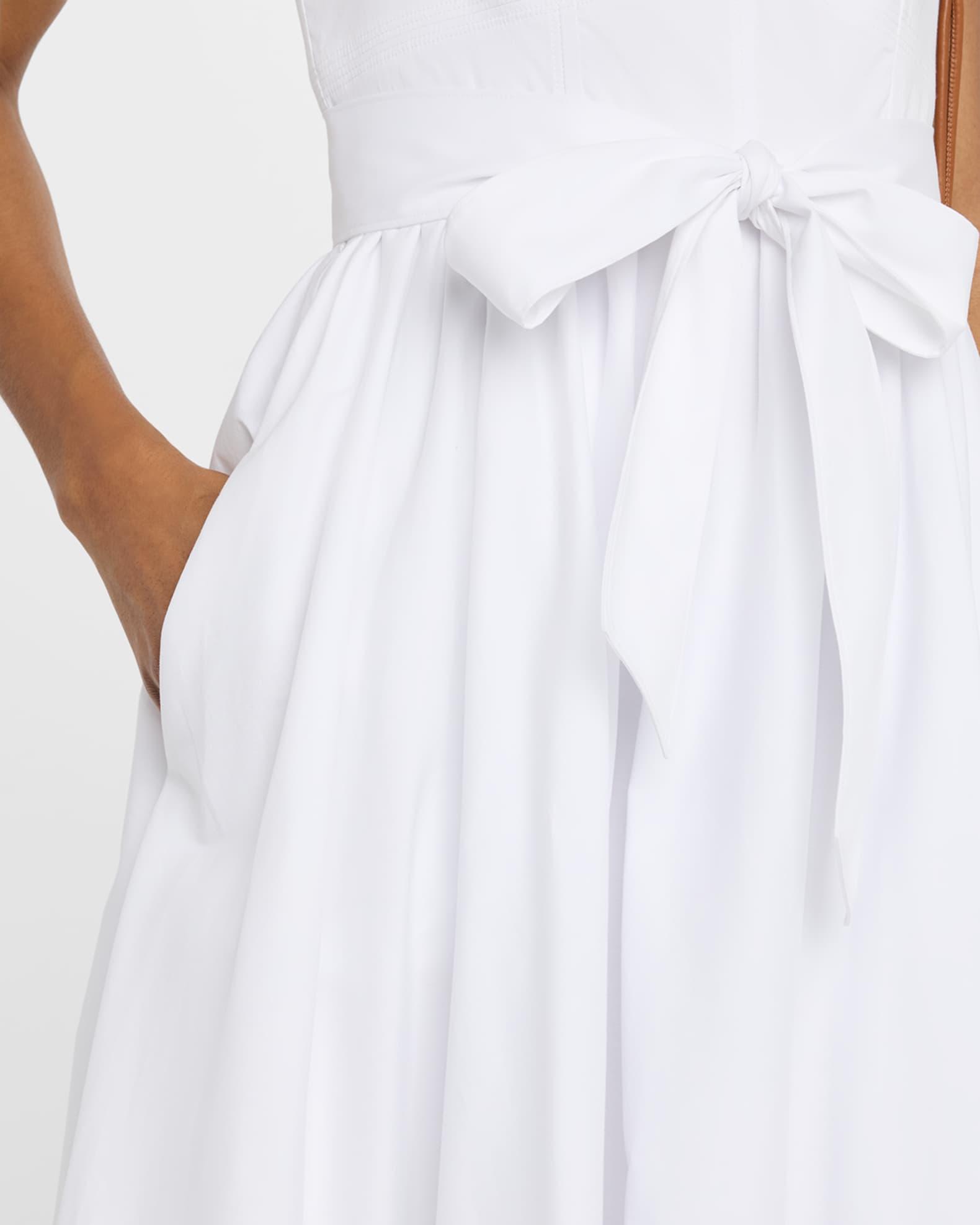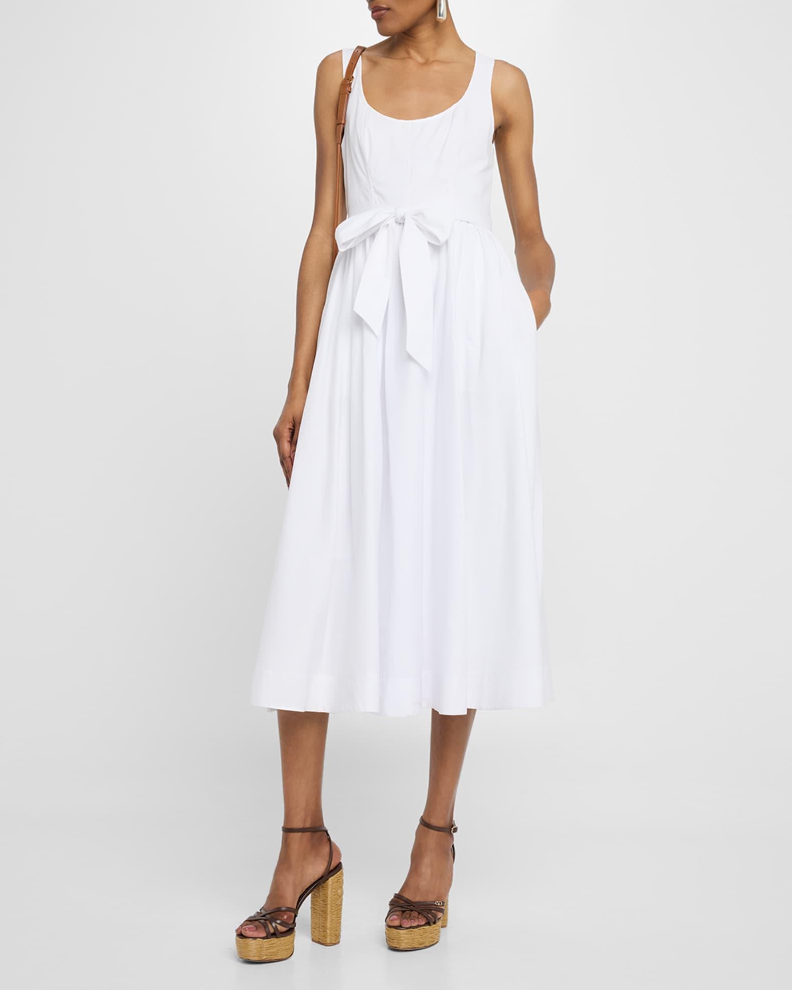 Cinq a Sept "Kilah" dress with a tonal self-tie sash belt Approx. 49.8"L from shoulder to hem Scoop neckline Sleeveless Hem falls below the knee A-line silhouette Invisible back zipper Cotton/nylon/polyamide/spandex Lining: Cotton Dry clean Imported Model is 5'10"/177cm.