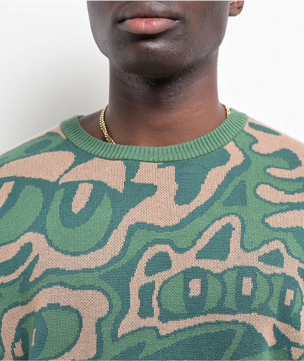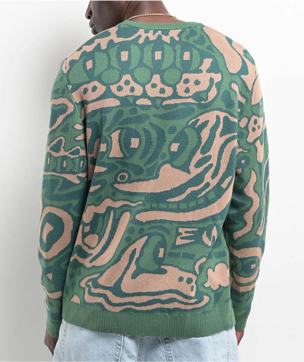 Delivering a psychedelic vibe, the Wild Kingdom sweater from Killer Acid comes in a green colorway. Made with a cozy cotton blend fabric, this long-sleeve sweater has a sublimated camouflage-inspired motif depicting various mysterious characters blen