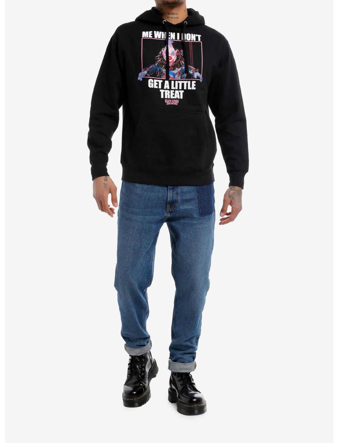 No treats? Big problem. This Killer Klowns from Outer Space hoodie features a creepy clown graphic and the phrase, "Me when I don't get a little treat."80% cotton; 20% polyesterWash cold; dry lowImportedListed in men's/unisex sizesModel is 6'1''Model wears size Medium