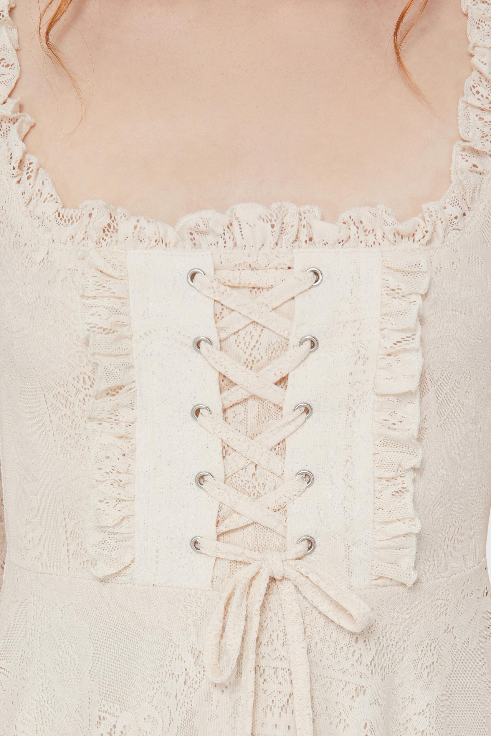 KILLING KISSES LACE- Luxe, slight stretch custom lace.- Long flared sleeves with ruffle hem and opening from elbow to wrist.- Front fixed lace up detail.- Squared neckline with ruffle hem.- Mini dress length with slight high low hem.- Back concealed zip fastening.- Lined.- Designed in Brighton, England.Model is 5'8 and wears a size XS.With KILLSTAR branding, 100% Polyamide.Hand wash delicate (30°c) / Do not bleach / Do not tumble dry /Iron at low temperatures / Do not dry clean. Imported.BelladonnaWe've reimagined our iconic KILLSTAR Belladonna lace with a new twist — now with added stretch for an even more flattering fit. Sumptuous black, warm ivory, and decadent plum lace weave together in hauntingly beautiful silhouettes that echo timeless gothic romance. Complete the look with bold statement belts and custom-designed accessories, crafted to elevate every ensemble into something unforgettable.
