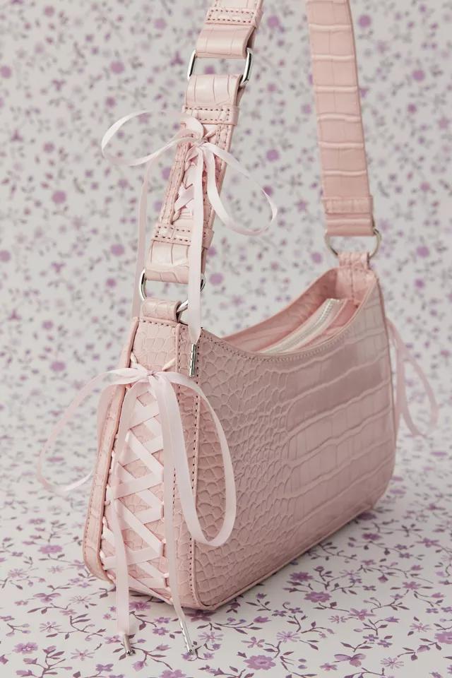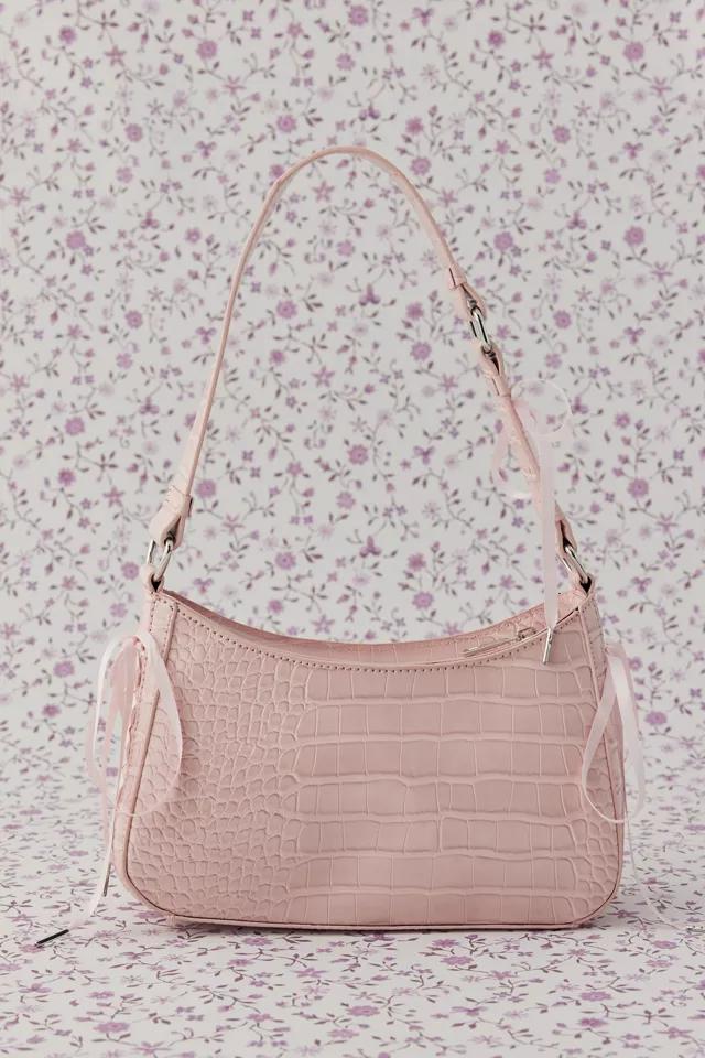 Tough-but-sweet Kimchi Blue croc-embossed bag with satin ribbon detailing. Slim structured bag silhouette complete with a lined interior and secure zipper closure.
