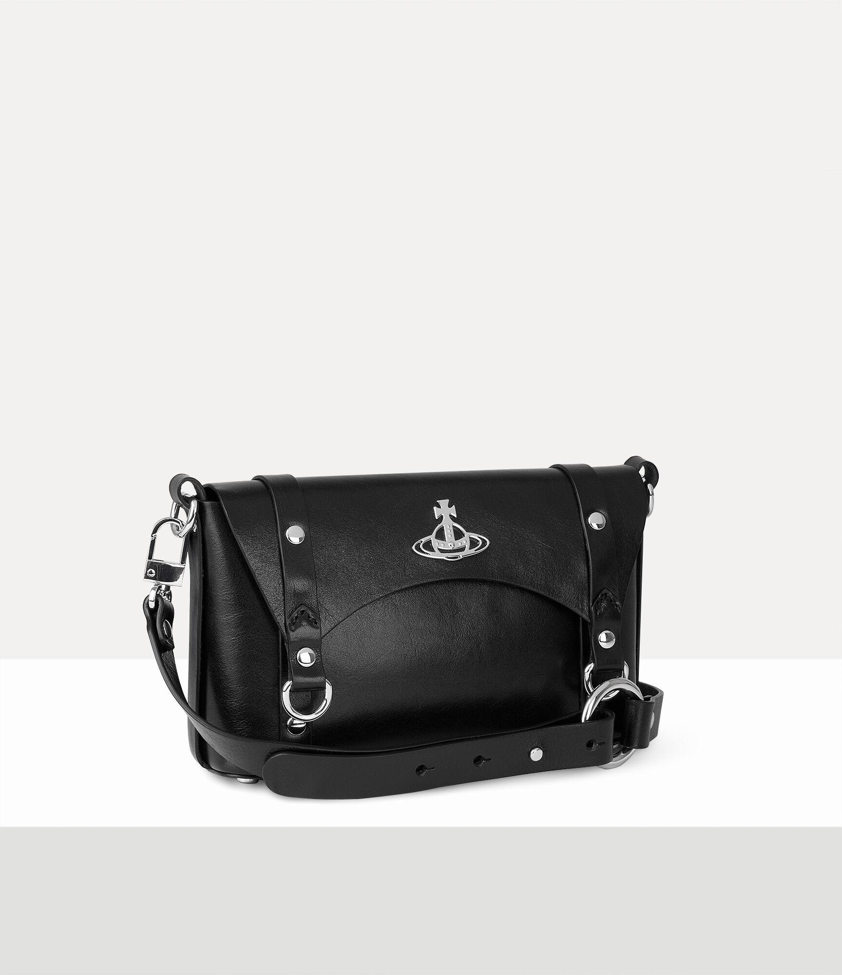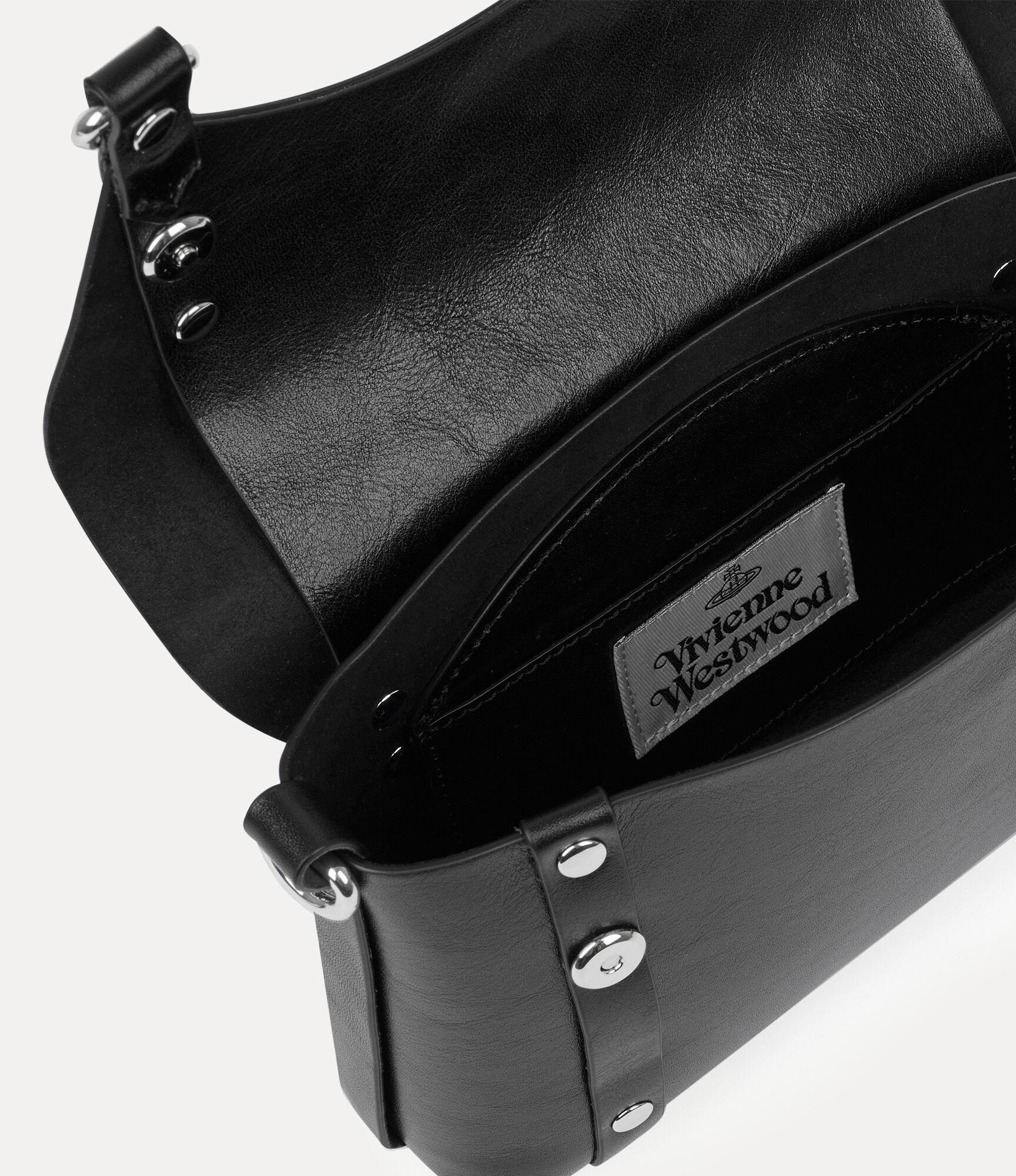 Our Kimmy Crossbody bag is crafted in a high-shine leather finish, detailed with silver-tone hardware and stud accents that nod to the Spring–Summer 1995 ‘Erotic Zones’ collection. Designed with a raw, unlined interior, the piece is finished with the house’s ‘Line Orb’ motif on the front flap.