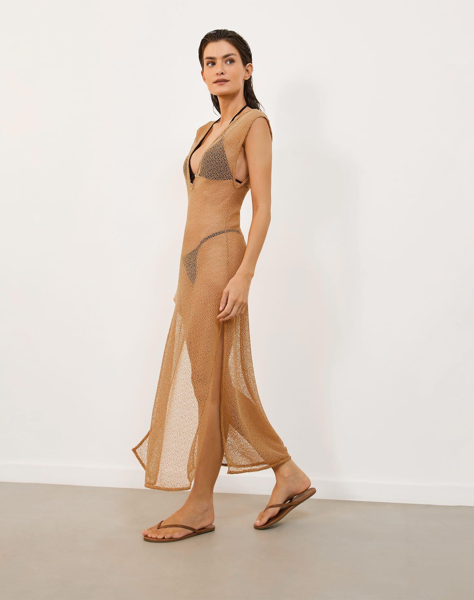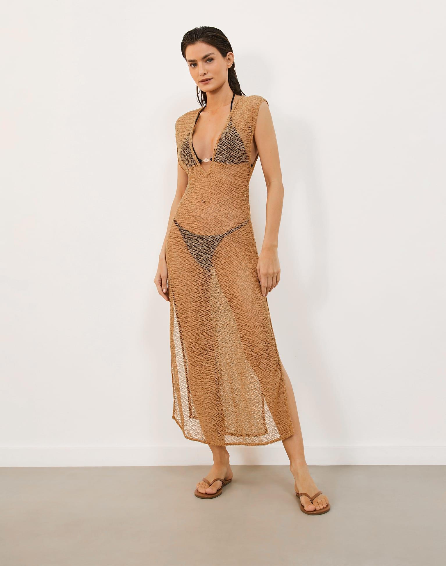 Long beach cover-up in mesh fabric, featuring side slits and a V-neckline Create a casual beach vibe with this piece. Complement your style with flats, anklets, and a straw bag. Features: Long cover-up Side slit Unlined V-neck Style# 452-831-025