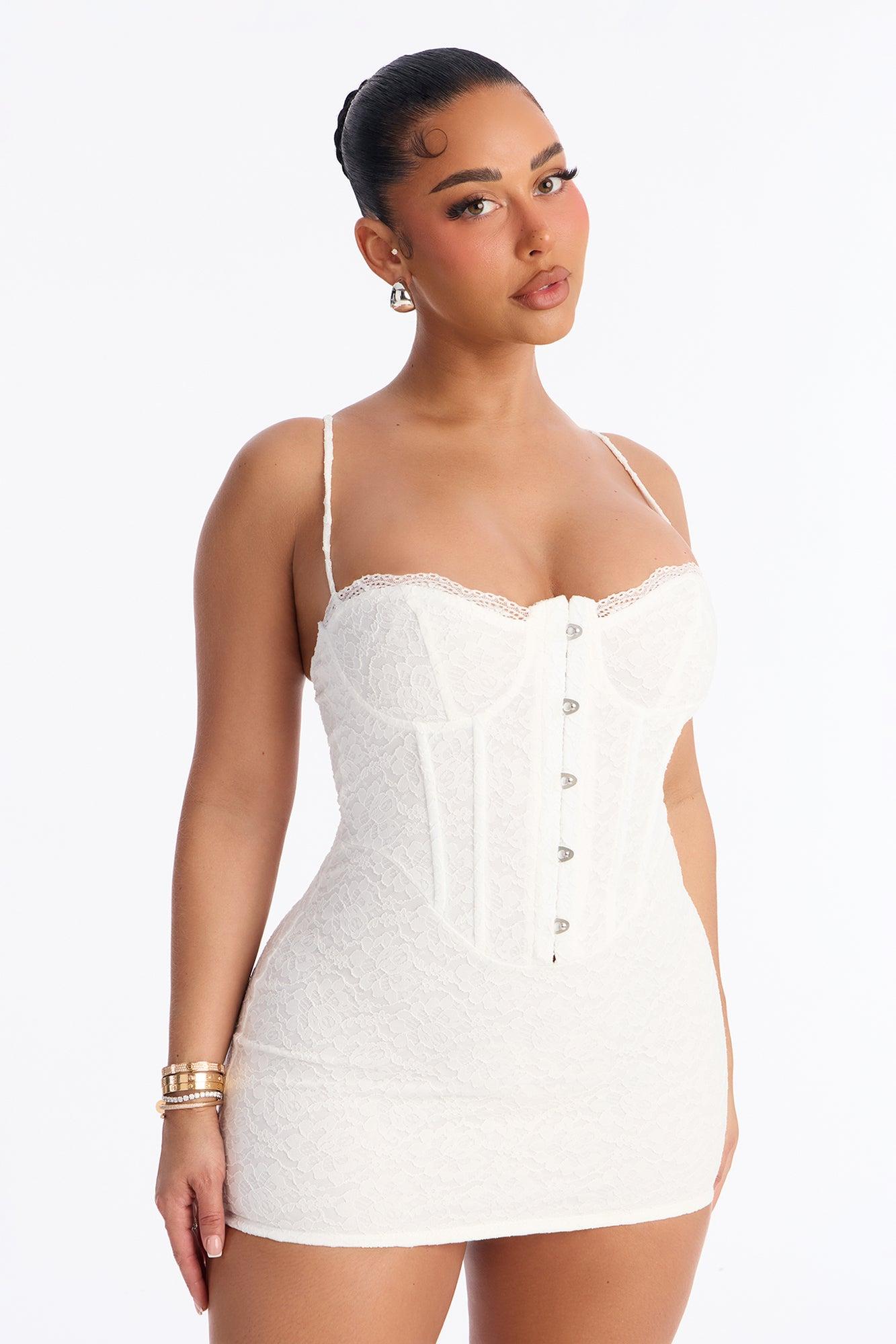 Available In Black, Mauve, Red, Taupe And White. Lace Micro Mini Dress Sweetheart neckline Adjustable spaghetti straps Hook and eye Corset waist w/ boning Lined Stretch Length measured flat = 29" Shell:92% Nylon 8% Spandex Lining: 100% Polyester Imported