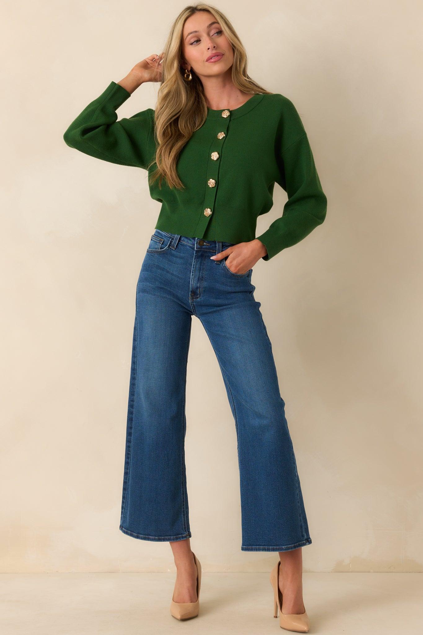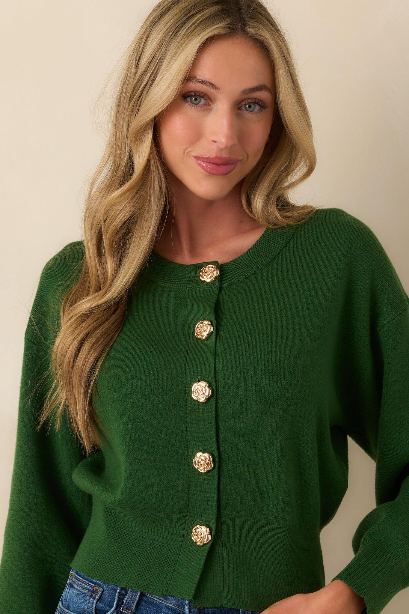 The Kind Of Comforting Hunter Green Button Front Long Sleeve Cardigan is your soft spot on busy days and quiet nights alike. It’s the piece you’ll keep nearby because it just makes everything feel a little better. This hunter green cardigan features a functional gold flower-shaped button front, long sleeves, a tapered fitted waistband, a crew neckline, and ribbed hems.