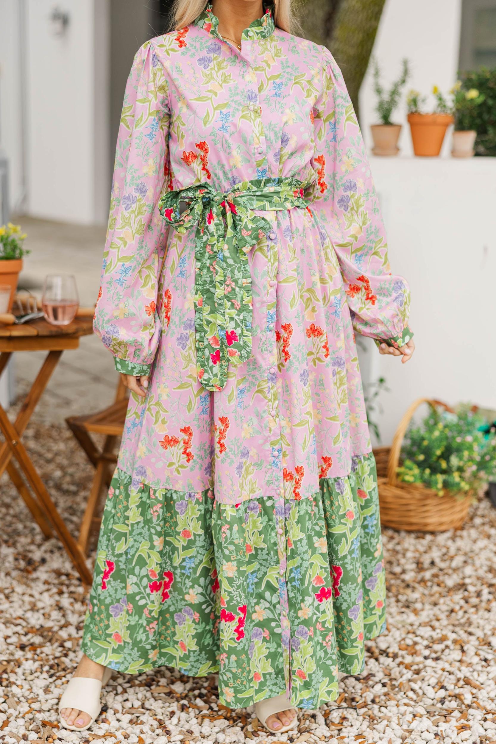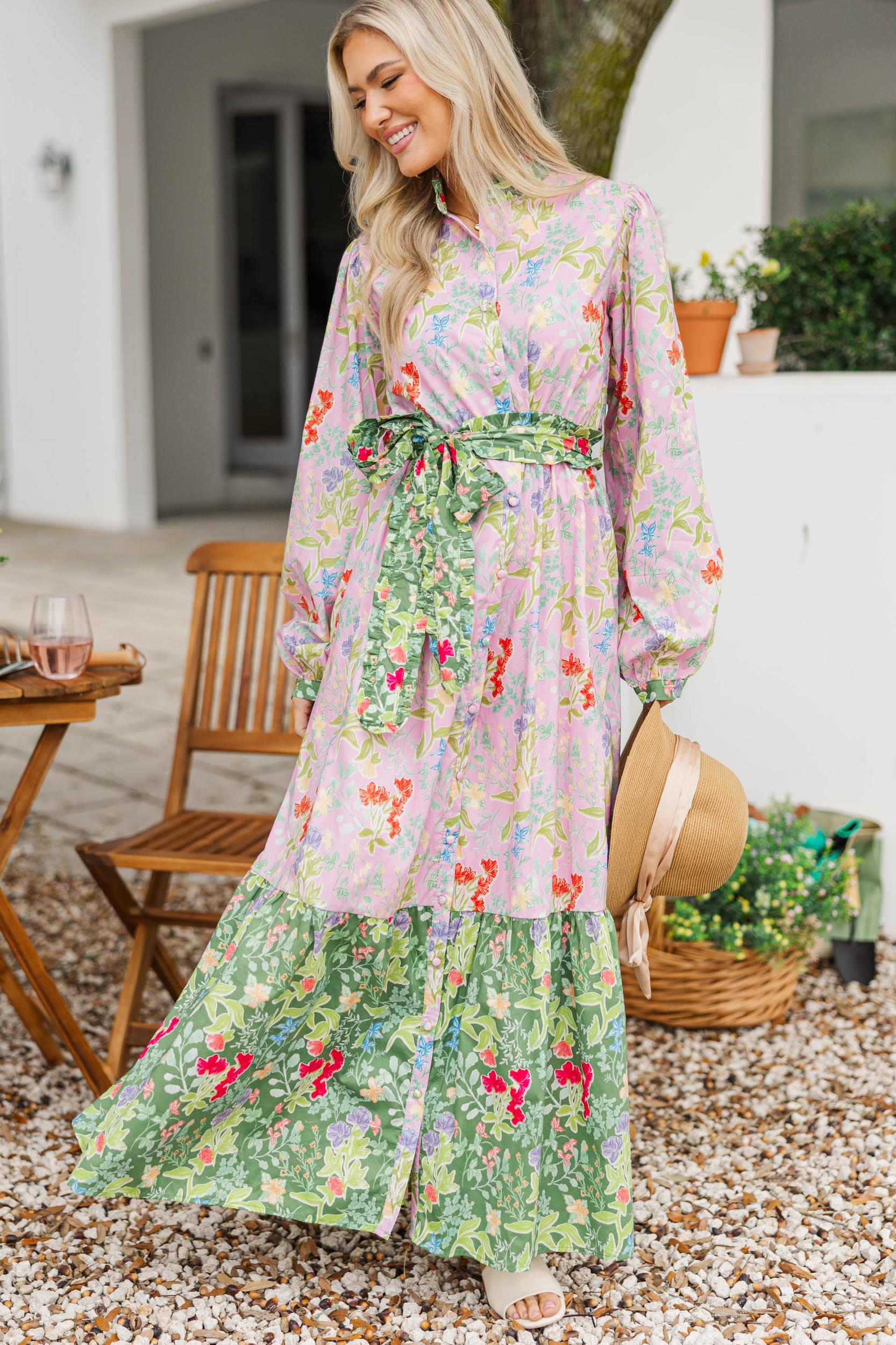 This romantic maxi dress is full of vintage-inspired charm with its mix of soft florals and beautiful color blocking. The flowing silhouette feels effortless yet elevated, while the matching tie belt defines the waist just right. It’s the kind of dress that makes every moment feel a little more special, from daytime events to evenings out. Collared neckline Long balloon sleeves Adjustable self-tie waist Maxi-length hemline Minimal stretch Baileigh is wearing the small.