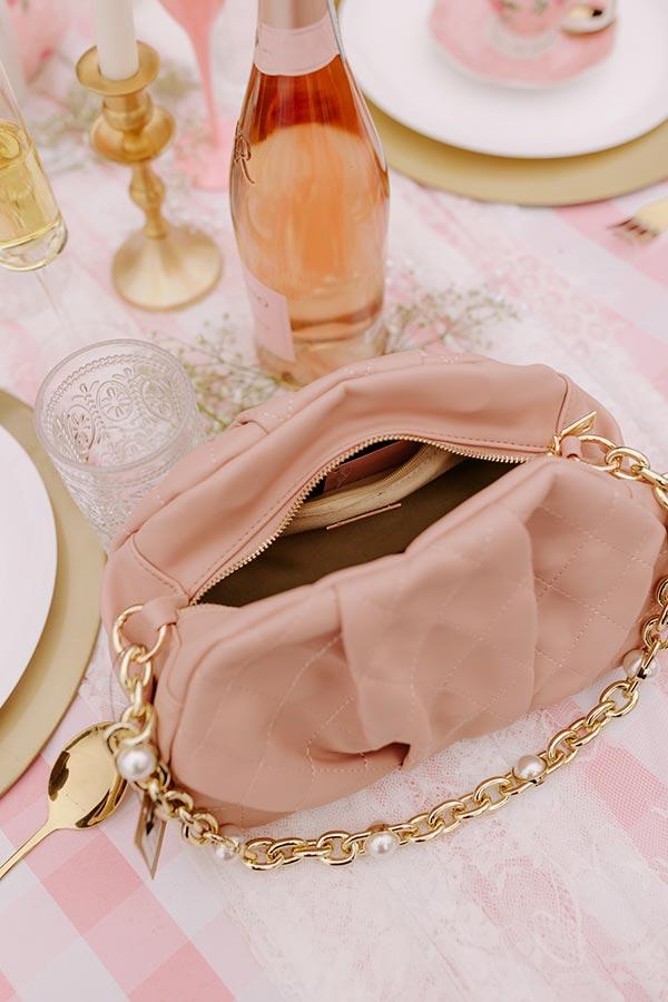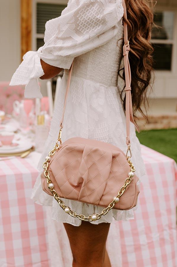 - Upgrade your look with this trendy purse! - Quilted faux leather material in a blush hue - Pleated detail - A spacious rectangular pouch with an interior zippered pocket - Zip and magnet closure - Gold hardware - A detachable chunky chain strap with faux pearl accents as well as a detachable faux leather shoulder strap with adjustable length