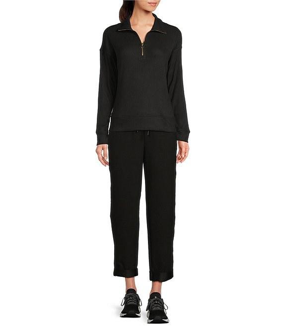 From Kinesis, these sweatpants feature: Comfortable light weight terry fabric Ribbed waistband with visible draw cord Side seam pockets Roll cuffs with tacks at side seams Pull-on construction Approx. 25.5" inseam Polyester/rayon/spandex Machine wash/tumble dry Imported.