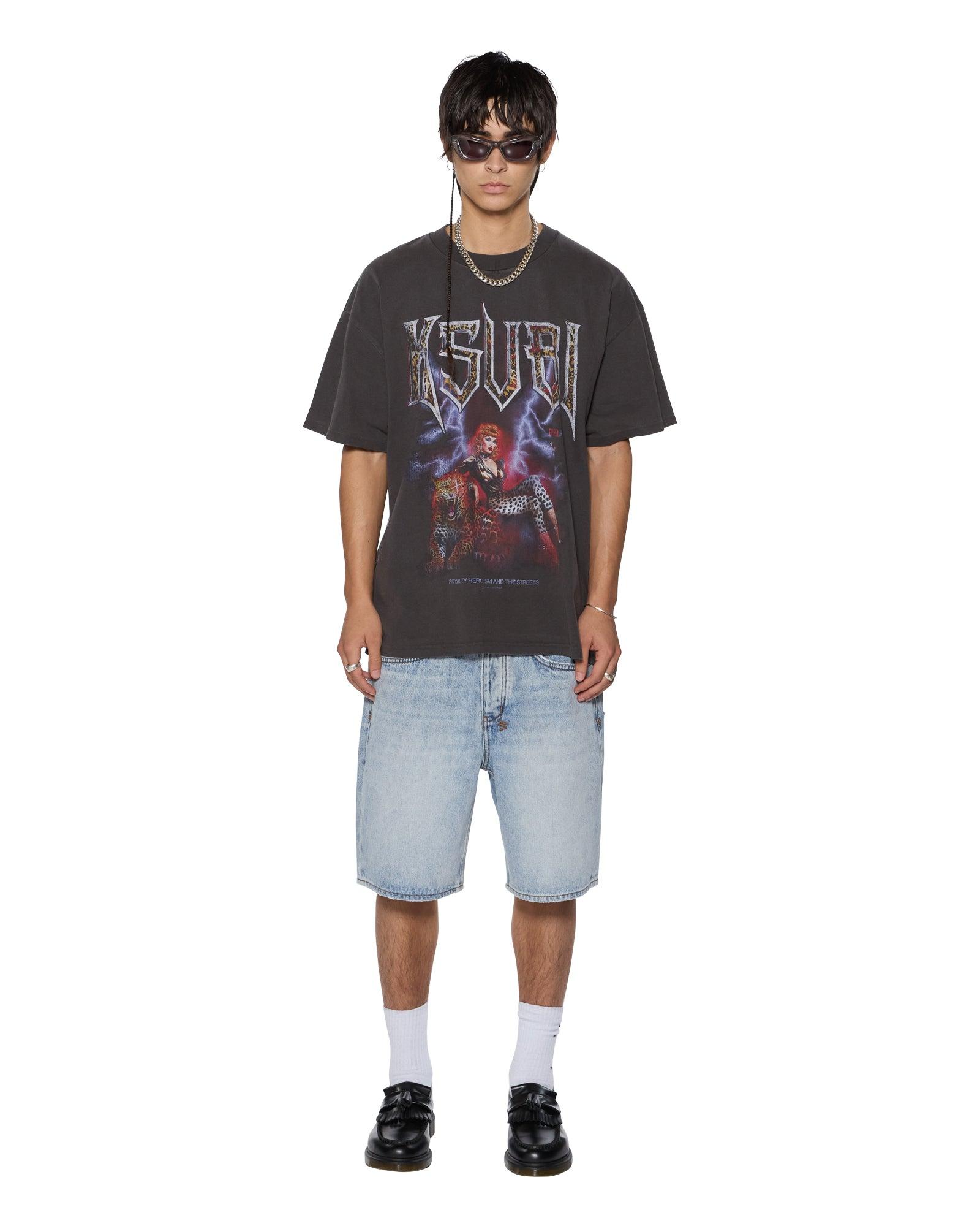 The Kingdom Ekcess SS Tee Faded Black is a regular fitted t-shirt with short sleeves and a crew neck, reverse overlocked side seam detail, and signature rats tail. Made from European cotton jersey in a jet black colourway, it features screen printed seasonal artwork at the front and back. Finished with signature t-box and 4x4 printed branding.