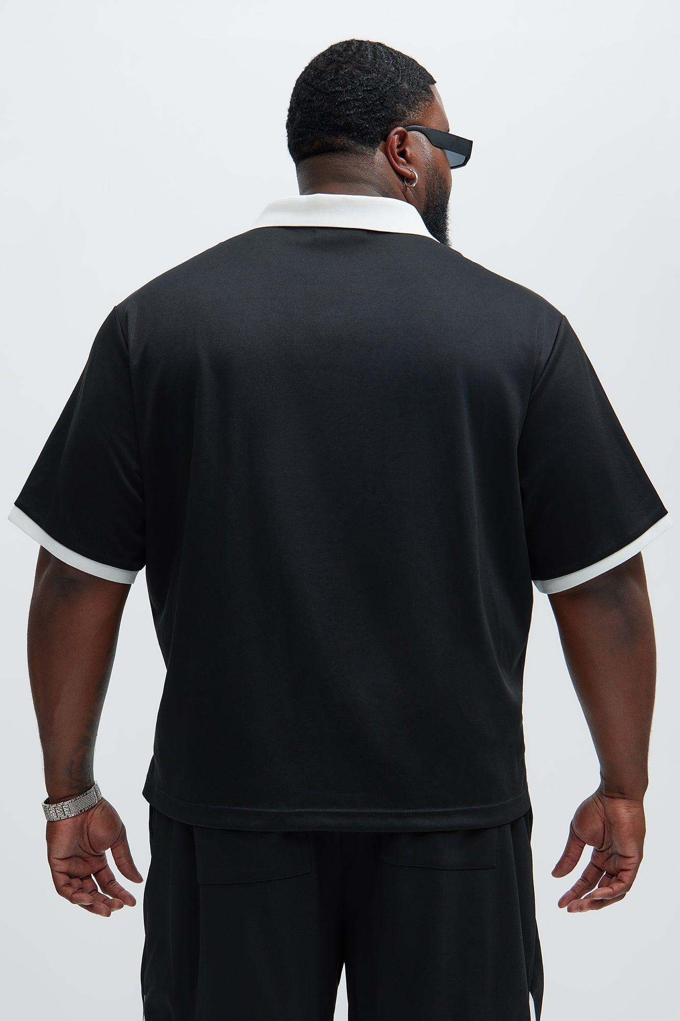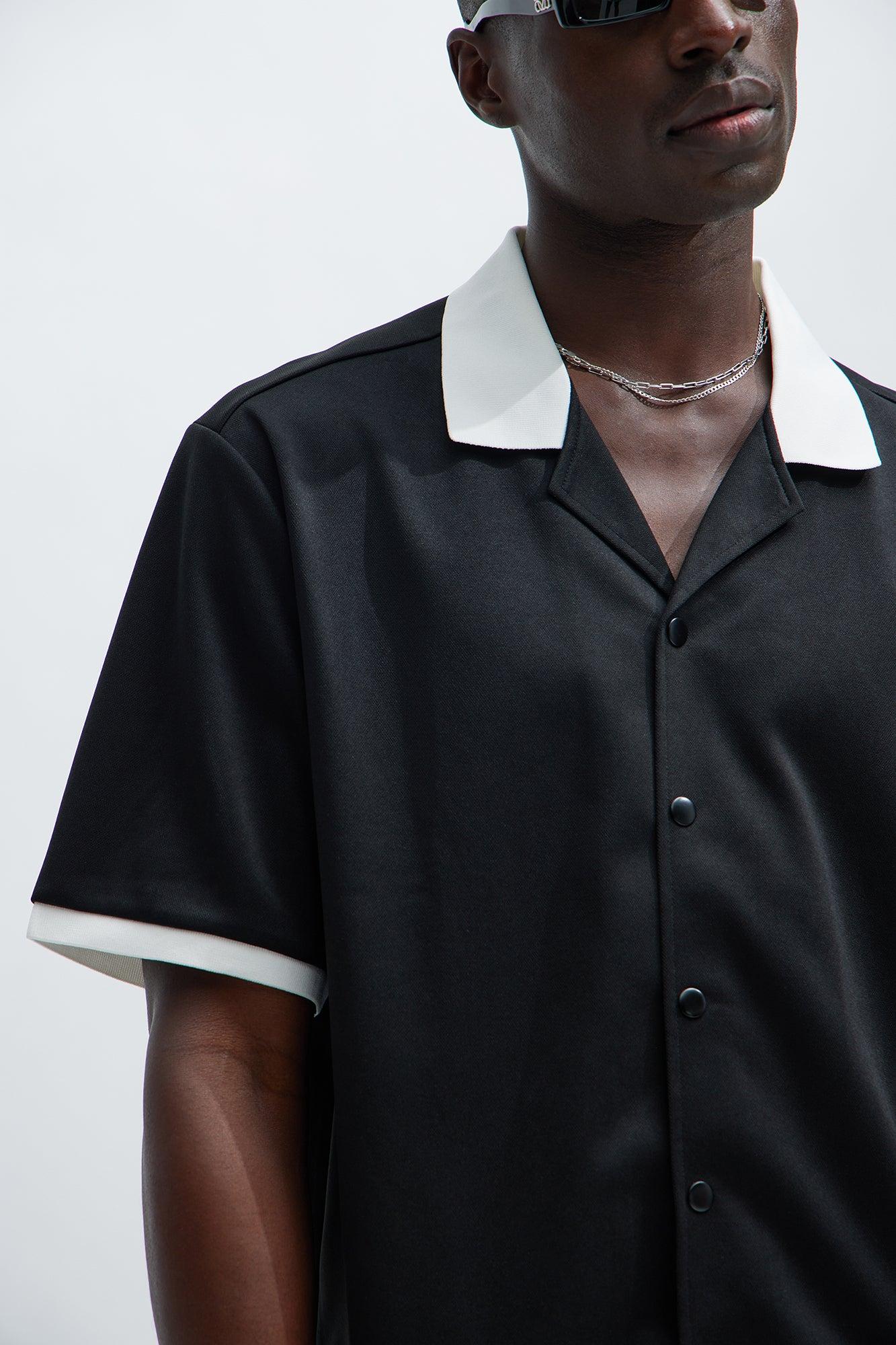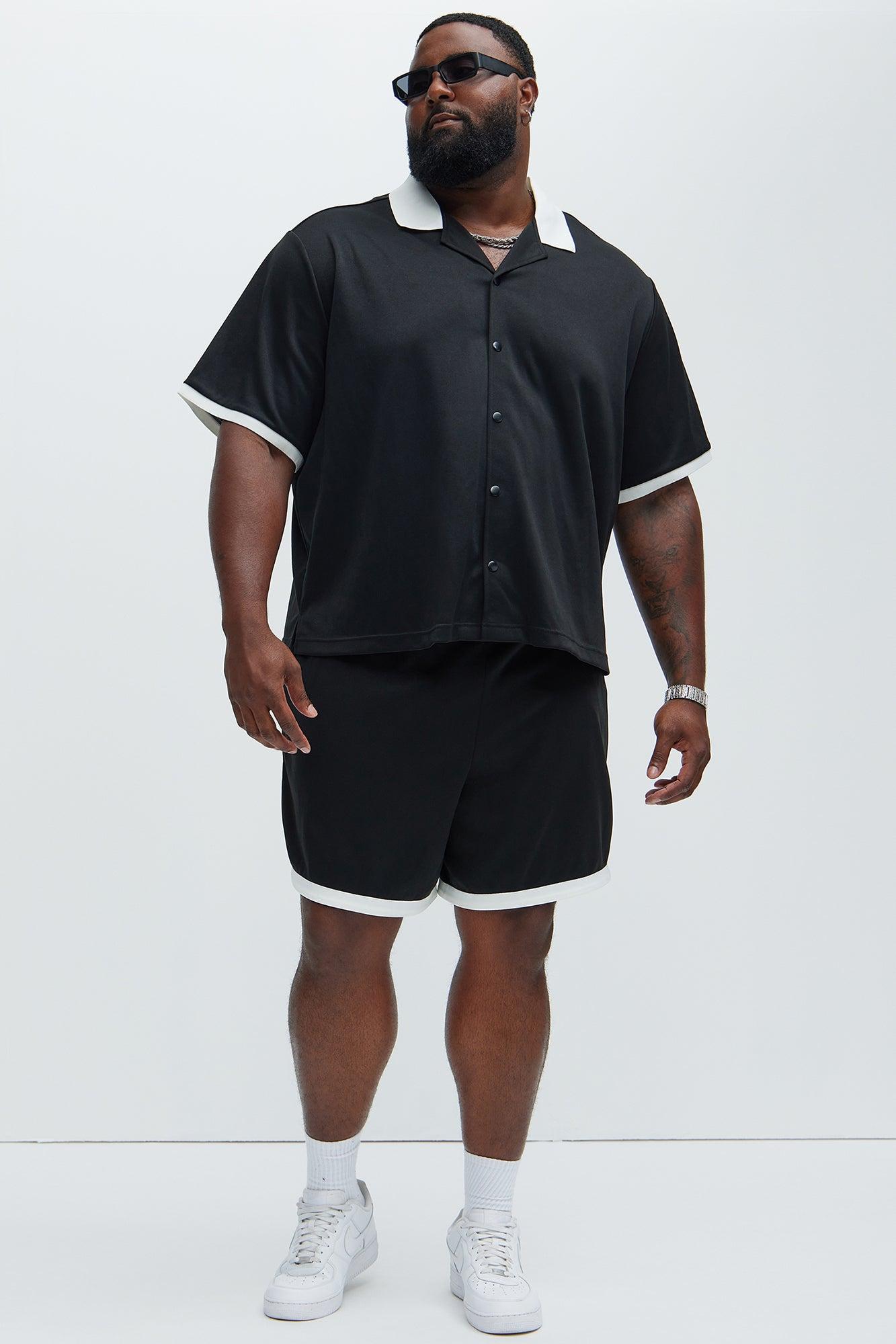 Available In Black. Fold Down Collar Front Button Closure Short Sleeve Bottom Side Slit Pair With "Kingpin Warmup Shorts" 97% Polyester 3% Spandex Imported