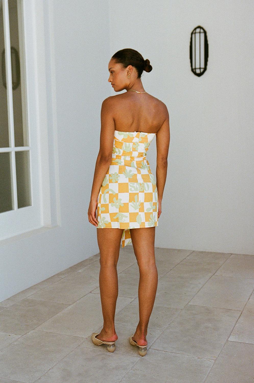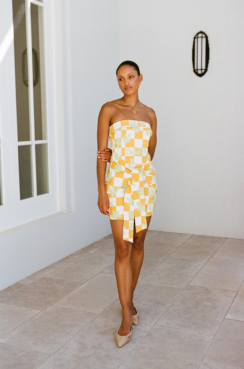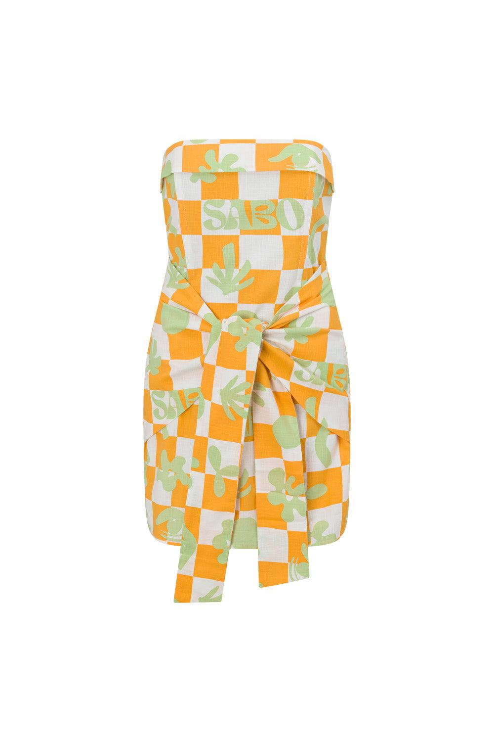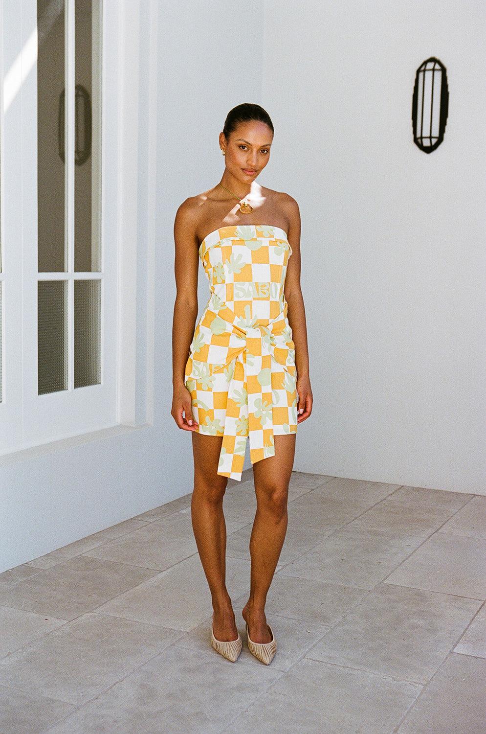*THIS IS A FINAL SALE ITEM and cannot be returned. See our Returns Policy here Obsessed with our new exclusive Sabo checkerboard print! The Kingsley Dress is made from a structured natural cotton fabric and features a straight strapless neckline with folded lapel, structured boned corset bodice and mini skirt with a bold waist tie detail. Dress it up with the Galia Heels for your next night out! Designed exclusively by Sabo.