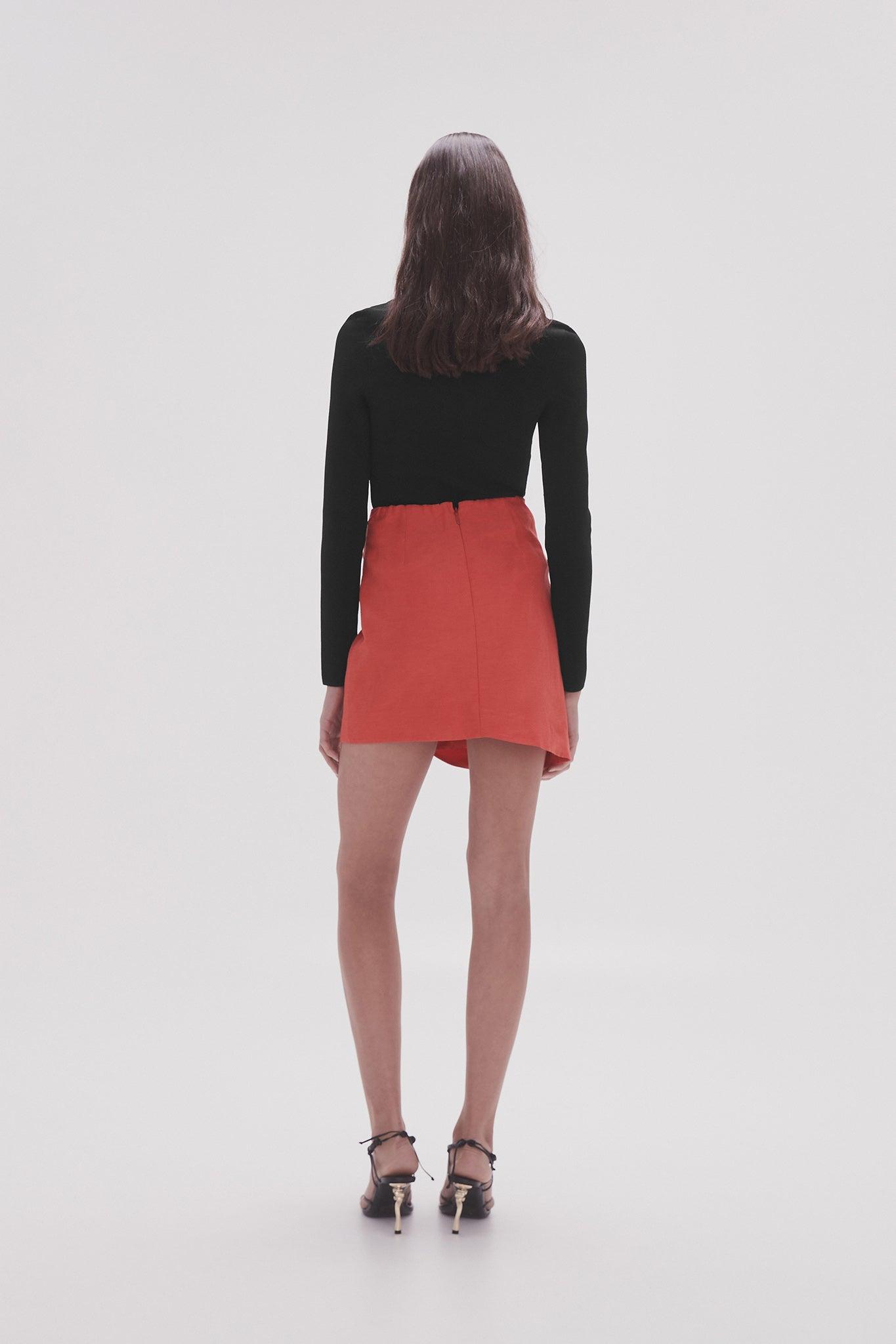 PRODUCT DETAILS Mini skirt Natural waist fit Draped overlay with tucks on left side Underskirt Asymmetric hem Zip, hook and eye closure Lined Shop All Skirts SIZE AND FIT Model wears a size AU 8/S Model: 180cm/5’11 Bust: 80cm Waist: 64cm Hips: 89cm FABRICATION Main: 69%linen 31%viscose Lining: 100% Cotton Dry Clean Only