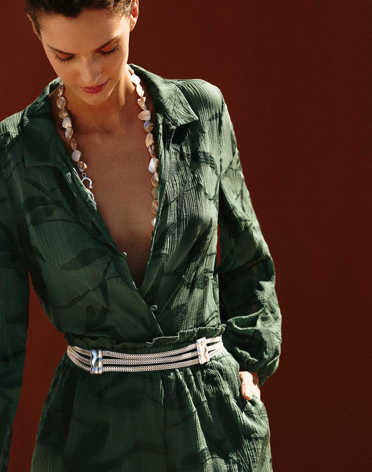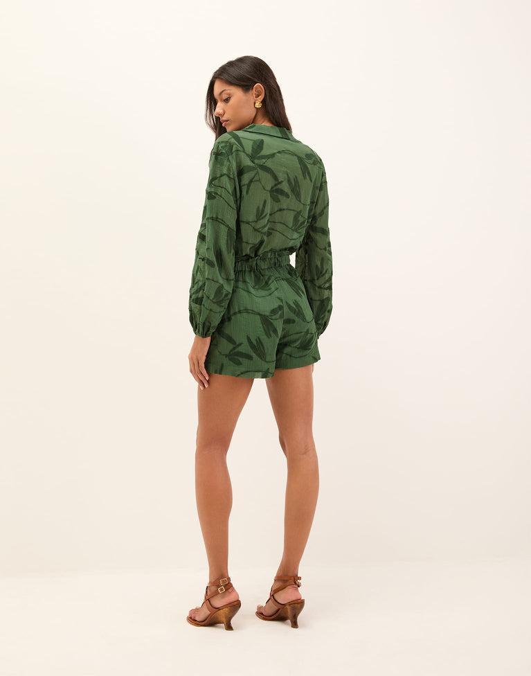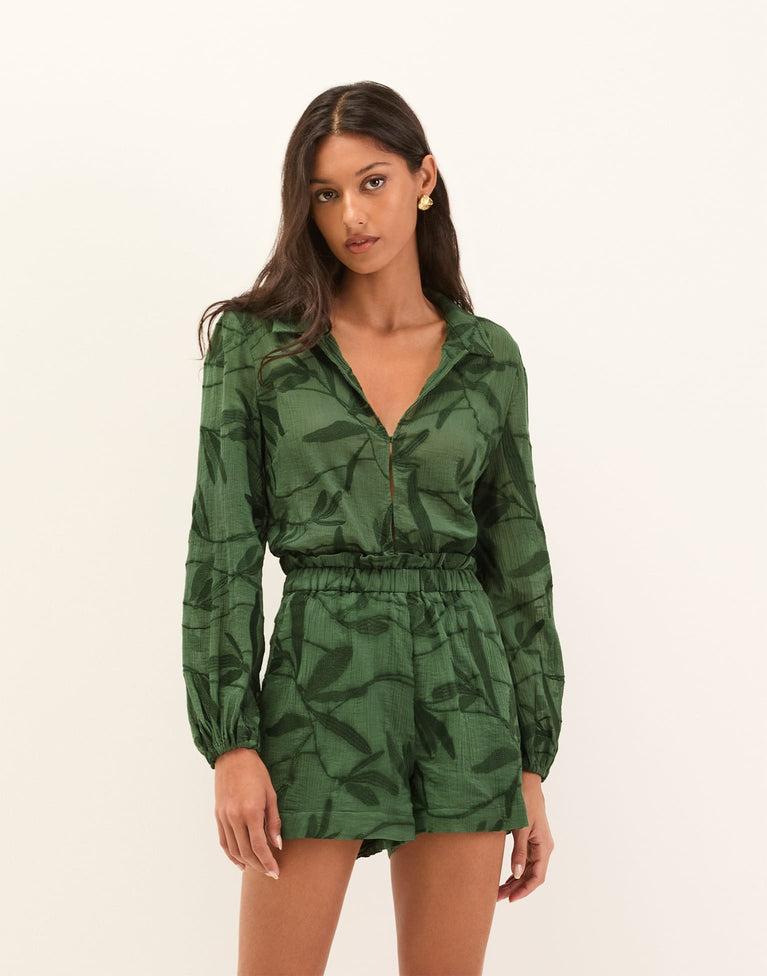The ViX Kinsley Blouse features a relaxed silhouette with a spread collar, long sleeves, and button-front closures. An embroidered leaf motif runs throughout for a subtle, textural finish. Style the Kinsley Blouse with shorts, a skirt, or pants and ViX accessories for a resort-ready look. Features: Long sleeves Spread
