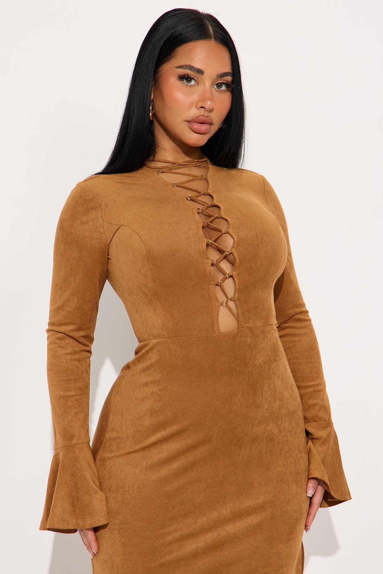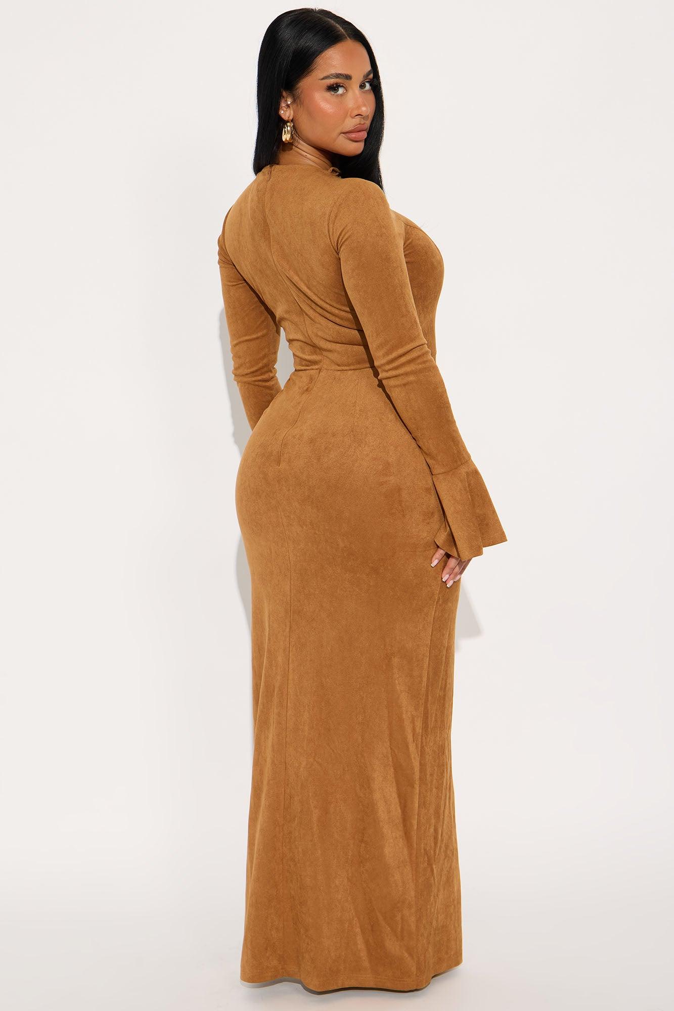 Available In Camel. Faux Suede Maxi Dress Long Bell Sleeve Deep V- Neckline Lace Up Side Slit Hidden Back Zipper Stretch Self: 88% Polyester 12% Spandex Imported California Proposition 65WARNING: Cancer and Reproductive Harm - www.P65Warnings.ca.gov.
