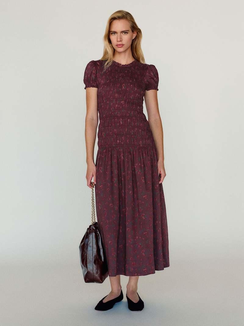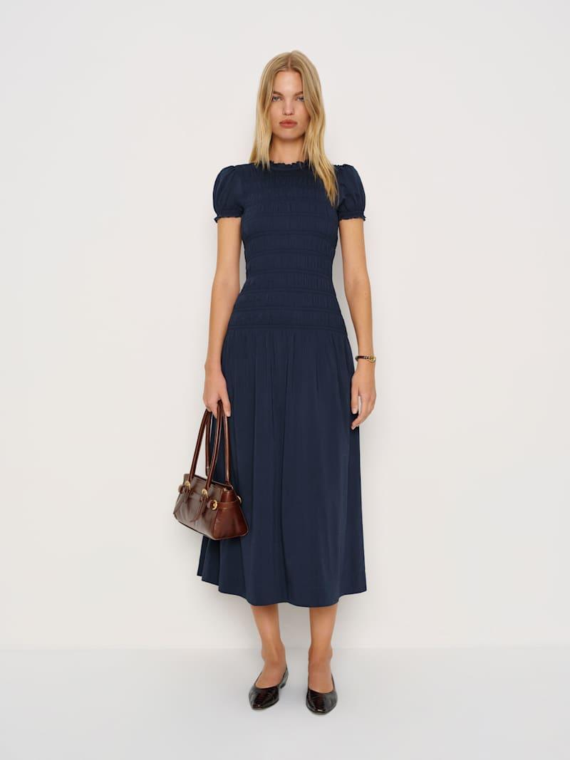 Wear the dress. Shop the Kiria Dress from Reformation, a short-sleeved midi dress with a drop waist and smocked bodice.