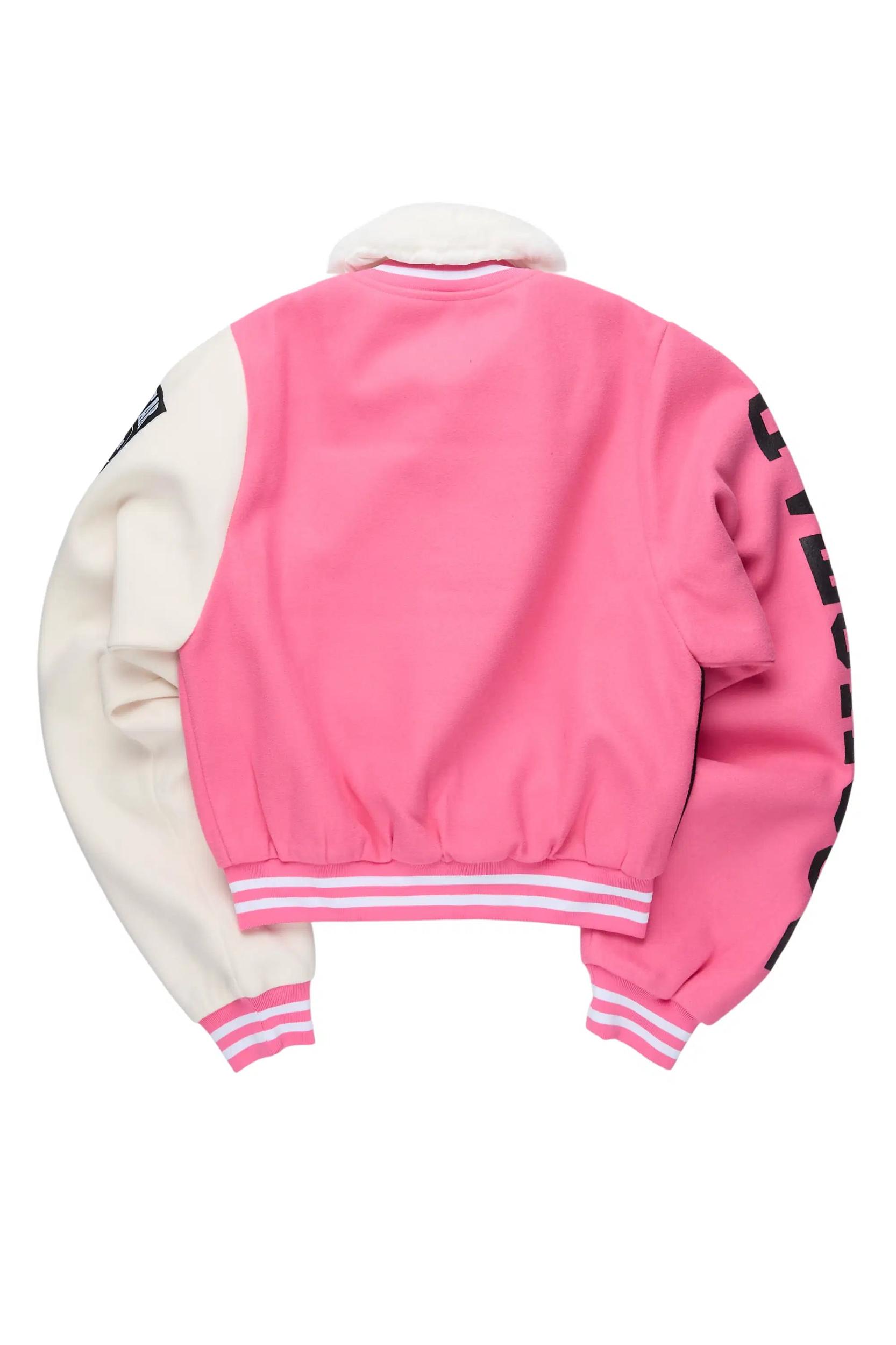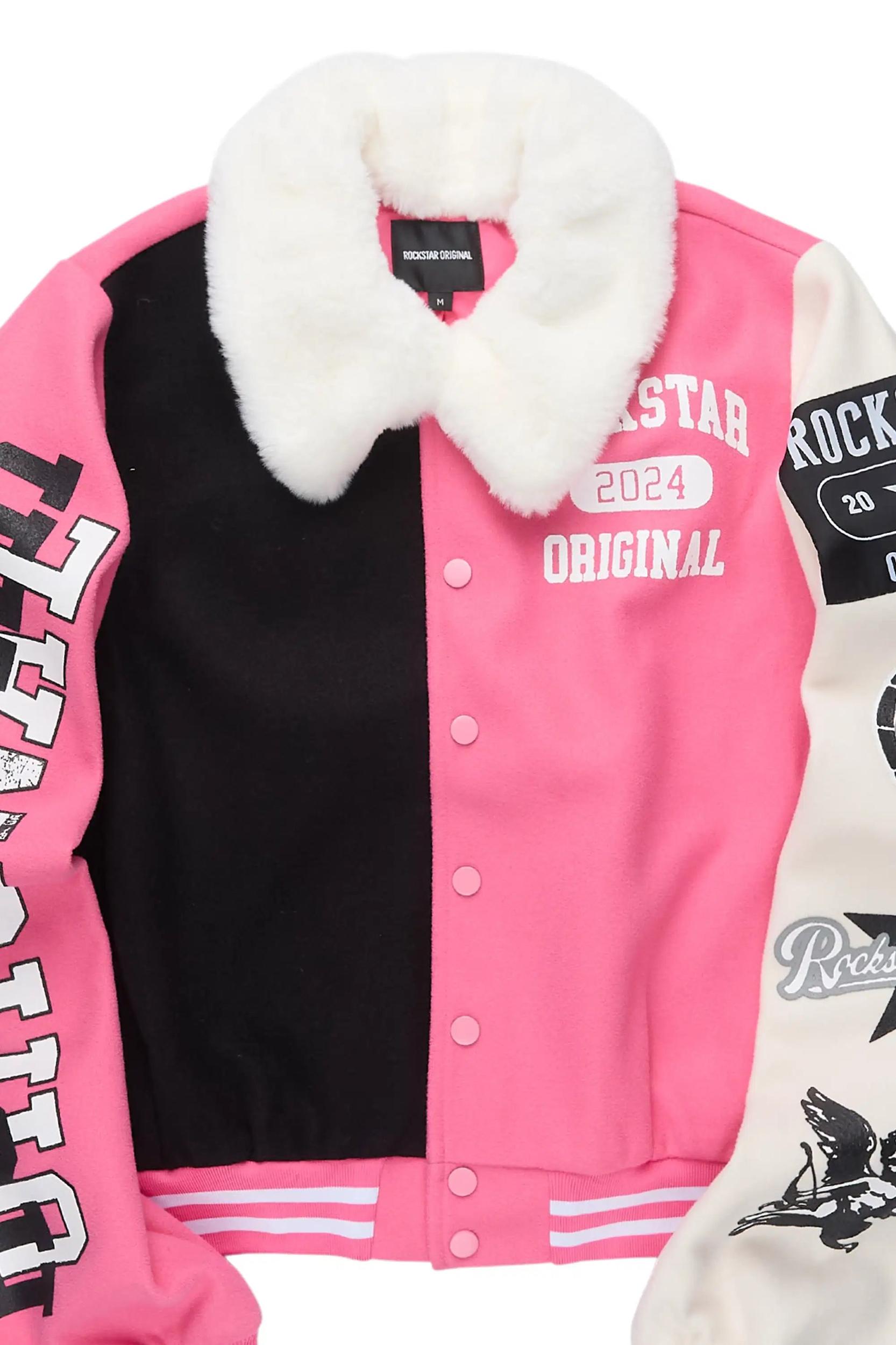 An urban cropped bomber jacket for women in pink, black, and white. Designed with a soft fur trim and quilted construction for the perfect versatile layering piece. Rounded neckline Full front snap button closure Ribbed knit trims Removable faux fur trim Custom RSO logos Custom graphics Cropped length