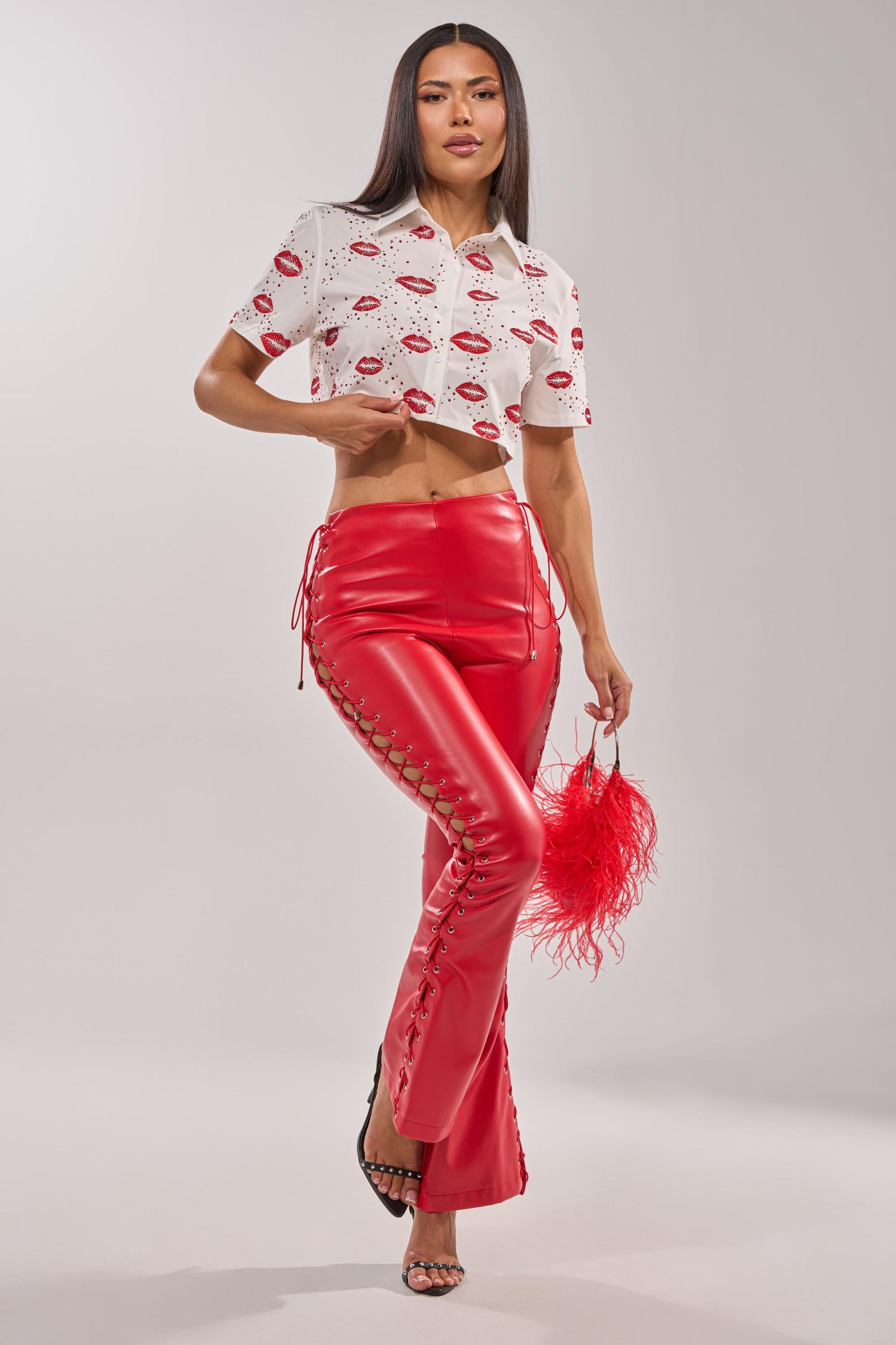 Pucker up! Sweet meets edgy in the AKIRA Label Kiss Kiss Rhinestone Cropped Button Down, featuring an allover red rhinestone lip print that adds sparkle, attitude, and a flirty pop of personality to your look. Crafted from crisp white fabric with a classic collar, front button enclosures, cropped fit and short sleeves, this standout top blends timeless shirt styling with eye-catching glam details. Perfect for parties, concerts, date nights, and trendy everyday outfits, Style this tops with jeans and red stilettos for a fabulous girly outfit. - 95% Polyester 5% Spandex- Hand Wash or Dry Clean- No Stretch- Imported (all measurements are approximate from size small)- 14.5” Shoulder to Hem- 16” Shoulder to Shoulder- 9” Sleeves (each)- Model is 5’9” and wearing size smallProduct ID: 1077752 (all measurements are approximate from size 1X)- 17.5” Shoulder to Hem- 18” Shoulder to Shoulder- 10” Sleeves (each)Product ID: 1077756